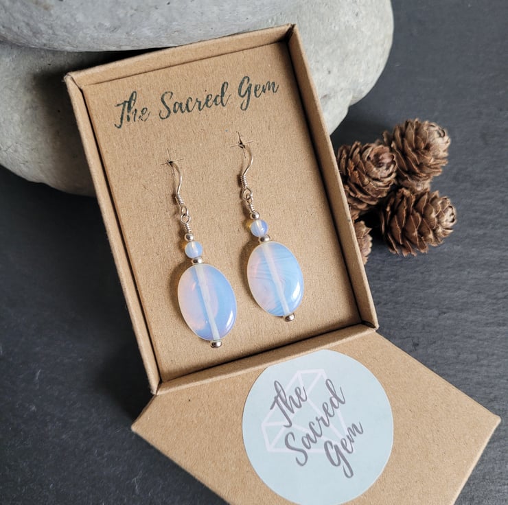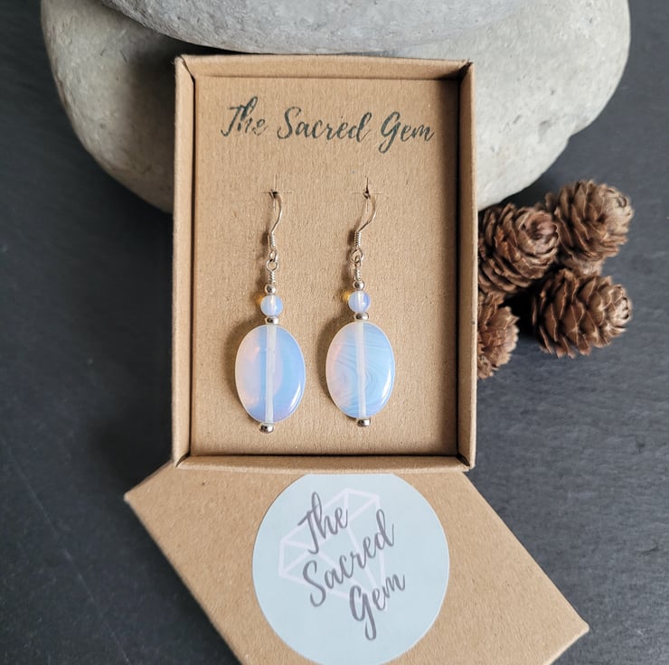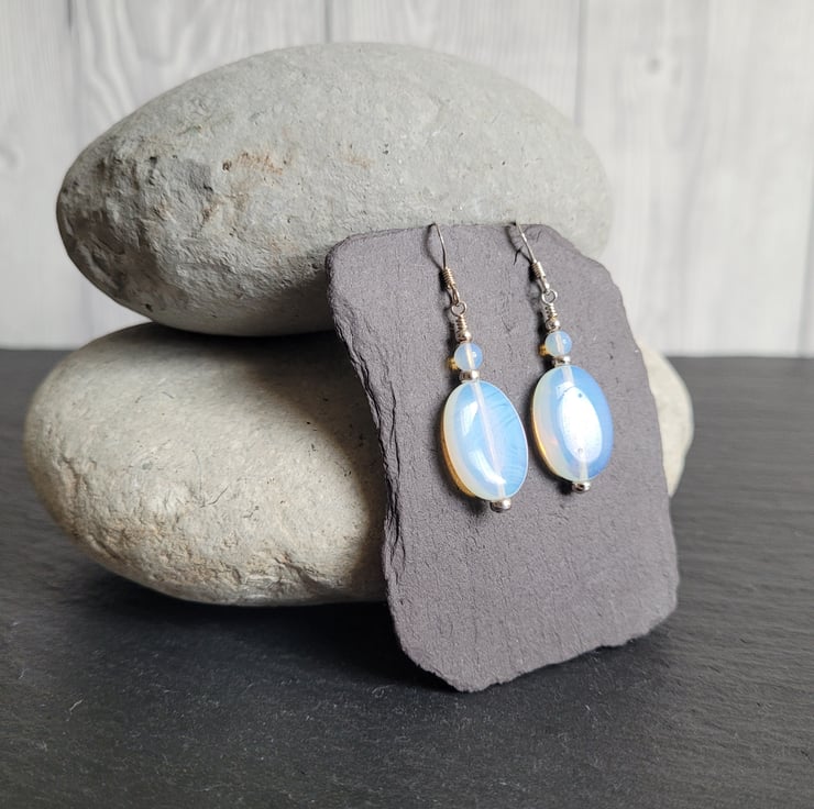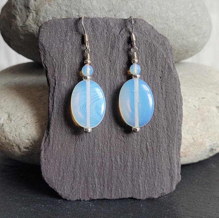 These pretty earrings are made with oval opalite and sterling silver beads. All the silver elements of the earrings are sterling silver which are kinder to more sensitive ears.