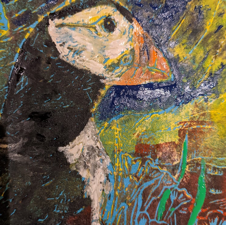 Unique linoprint from limited edition puffin and sea campion series. Hand inked on beautiful blue Nepalese paper to give a real colour pop!