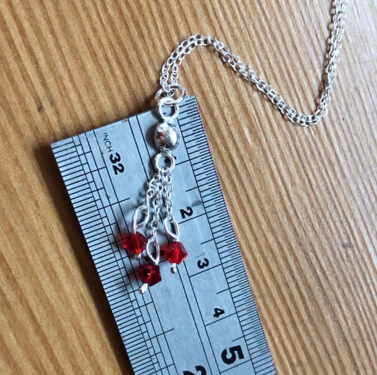 Made from recycled sterling silver, this pendant has a textured silver moon, with a red Swarovski crystals suspended on silver chain.