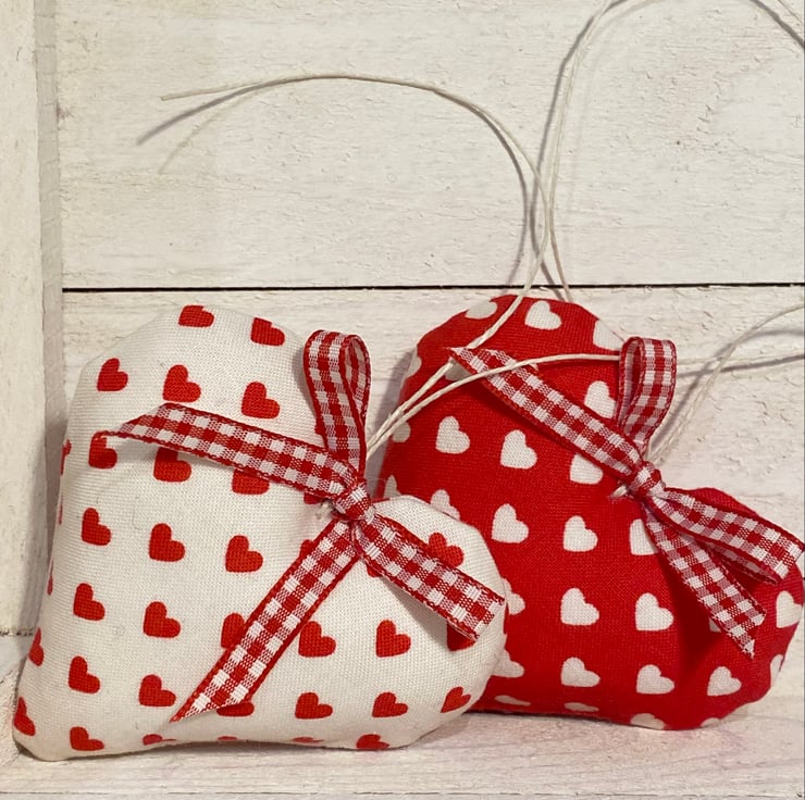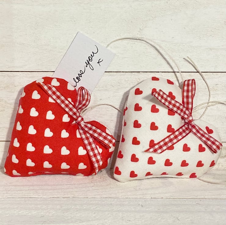 An abundance of love hearts on this charming heart decoration. Tiny red hearts on a white background, front and back, and finished with a country-style red and white gingham ribbon bow. Filled with either fragrant Hampshire lavender or with fluffy toy-grade stuffing. And there's a gift box option too.