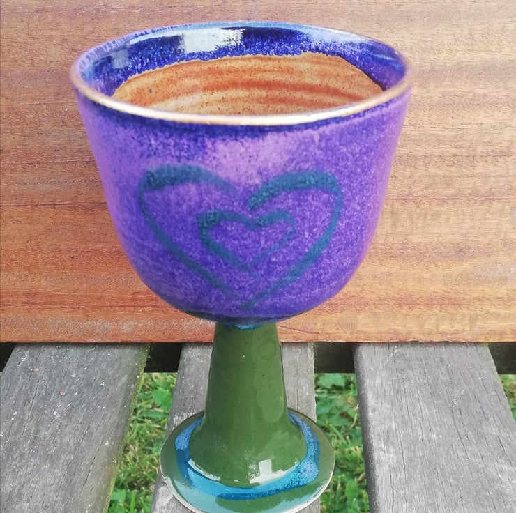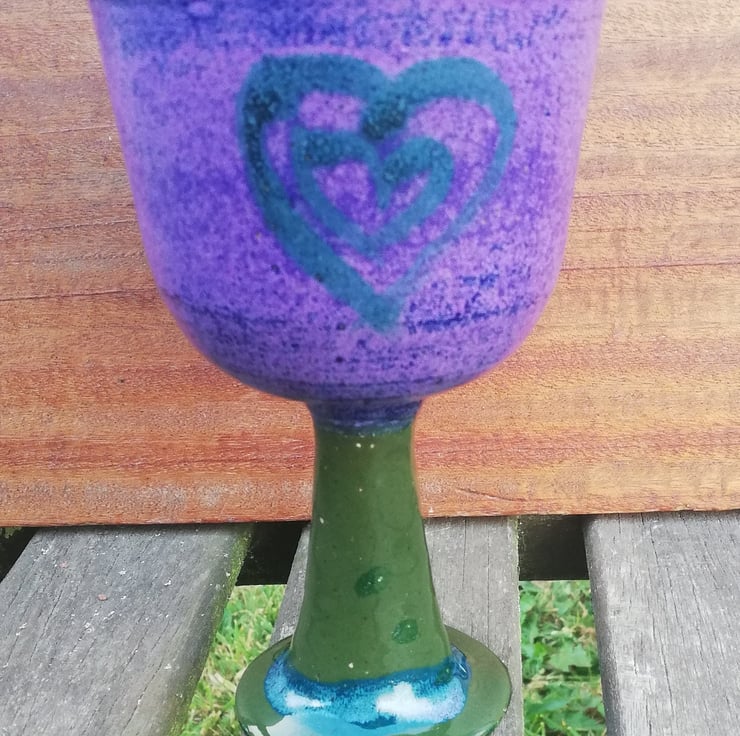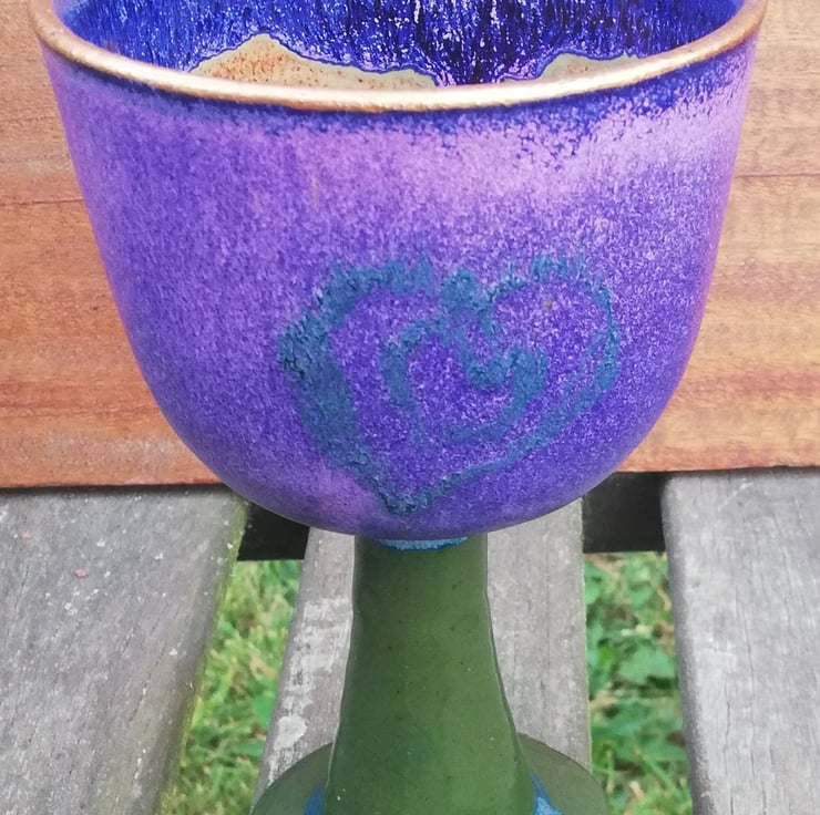 PGG1 Matte purple glazed goblet with subtle heart decor, gloss dark green stem and gold rim.