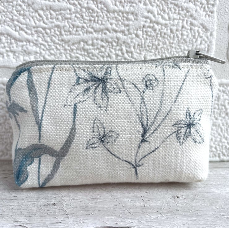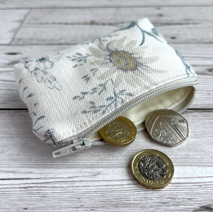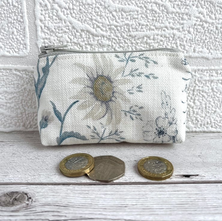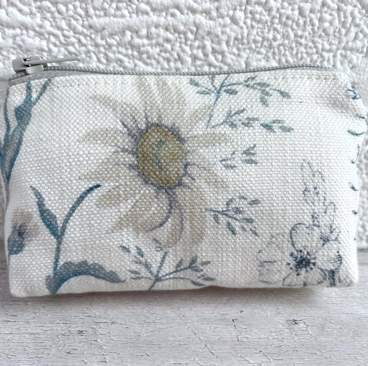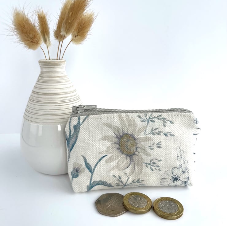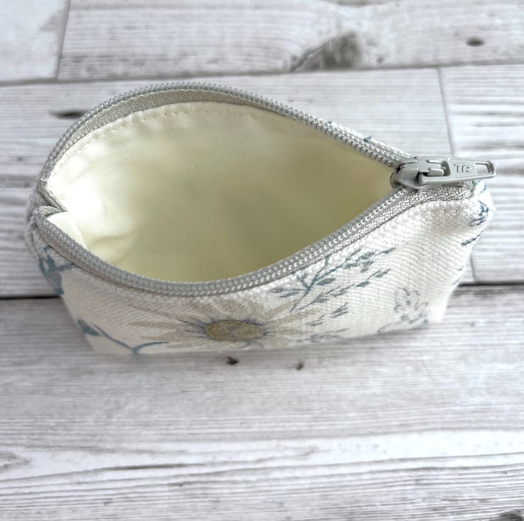 Summer meadow daisy coin purse. A small purse made from a lovely pastel print fabric. The pale cream fabric has a pattern featuring meadow plants, including a daisy and a grass seed head. The colour palette of the pattern is made up of pretty pastel shades of blue, cream, golden yellow and pale grey. The subtle, muted colours give a beautifully understated feel to the pattern. The purse has a pale grey zip, which co-ordinates well with the grey highlights in the pattern. The coin purse is lined with cream fabric, and has a boxed base to give a spacious interior.