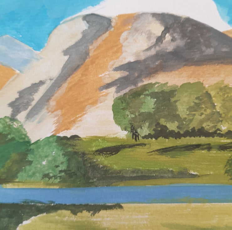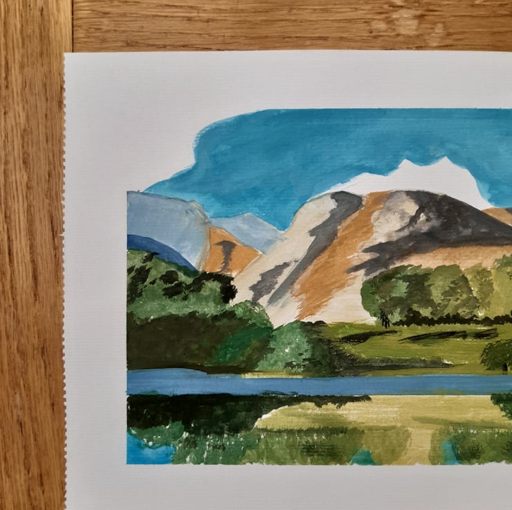 Watercolour, painting, on 230 GSM watercolour, 10.5 times 7.5 inches approximately ,depicting Lake District river and mountains, surrounded by countryside .The trees providing trees an array of green shrubbery, painted in a 1940s poster style. Please note once you have framed this, top left and top right side will then form clouds.