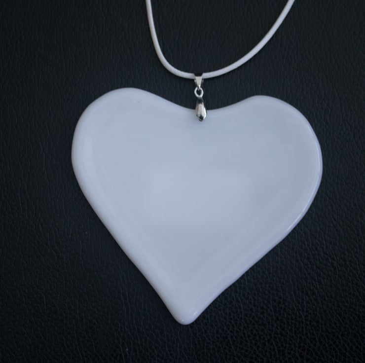 It is made from a single piece of hand-cut glass that has been fired to around 800 C, which rounds off the sharp edges and gives the glass strength. It has been drilled and fitted with a silver-coloured metal bail and the cord has been threaded through.