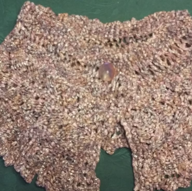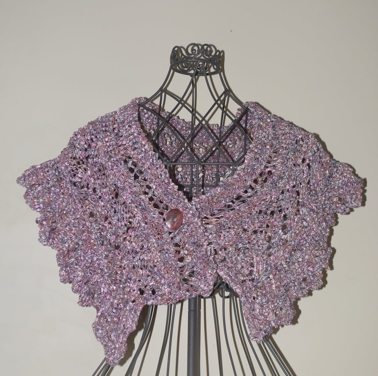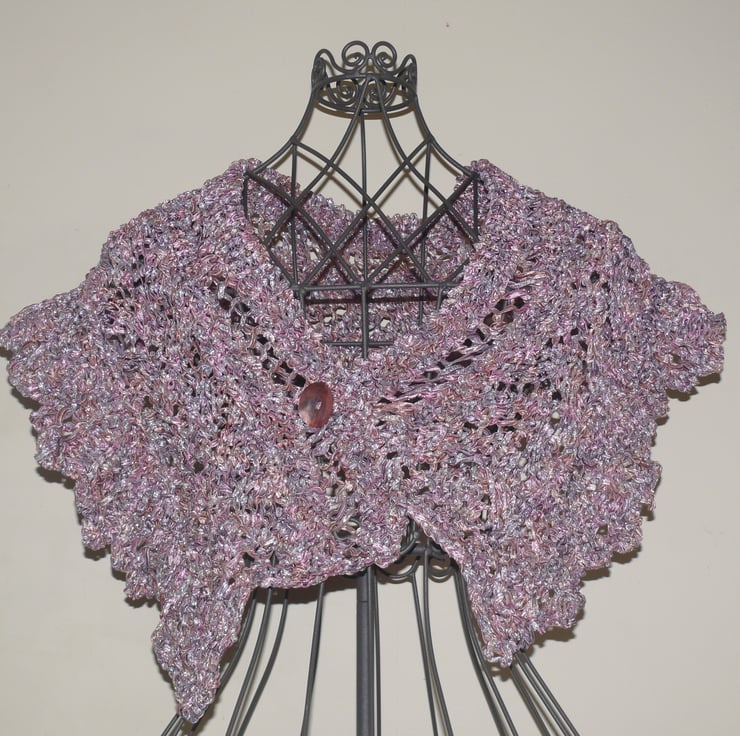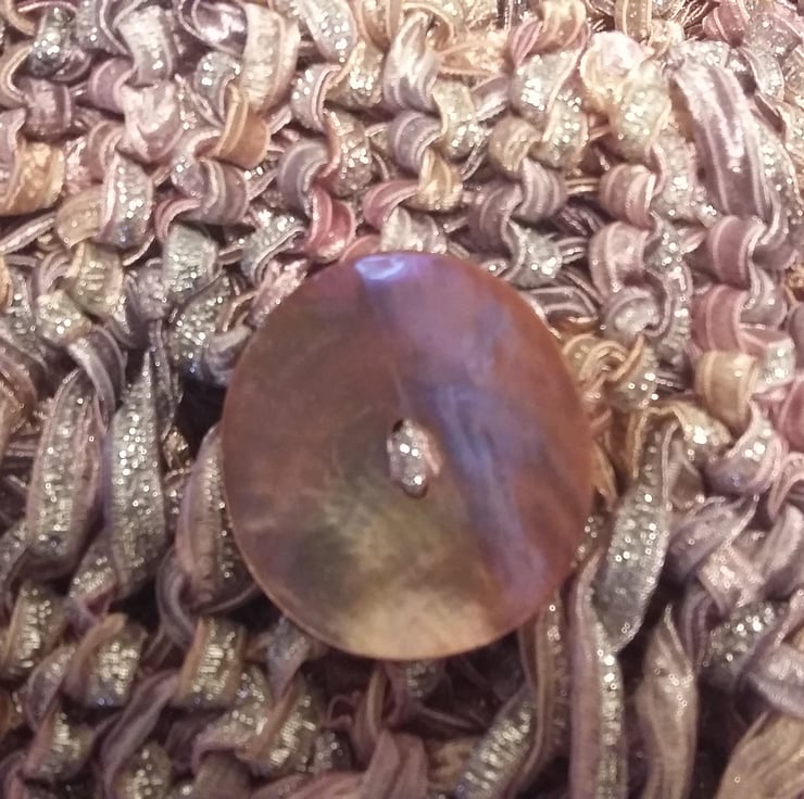 Hand knitted shawl in Louisa Harding Sari Ribbon Wool & finished with purlescent Mother of Pearl shell button.