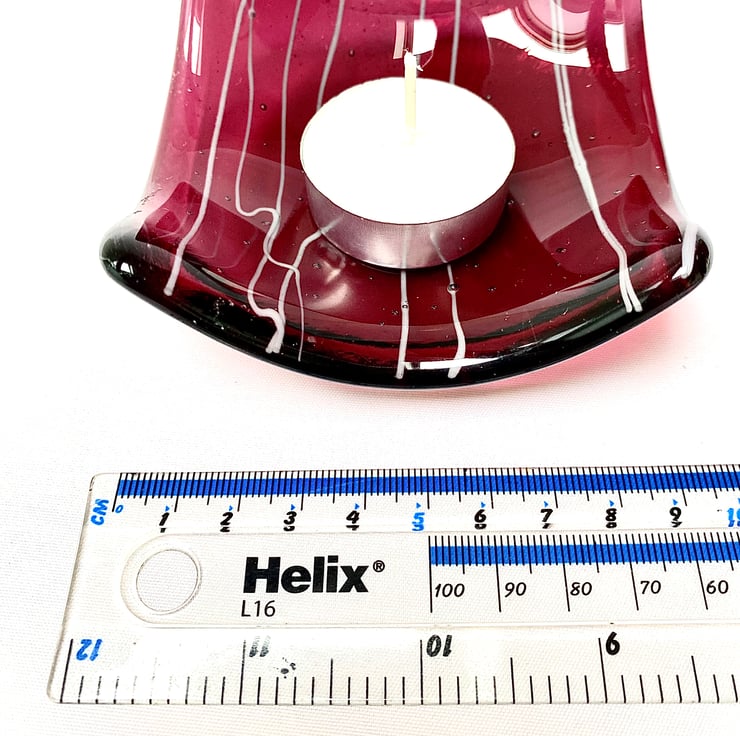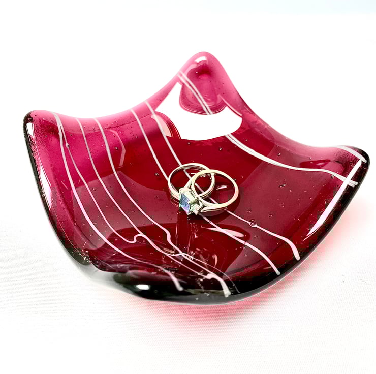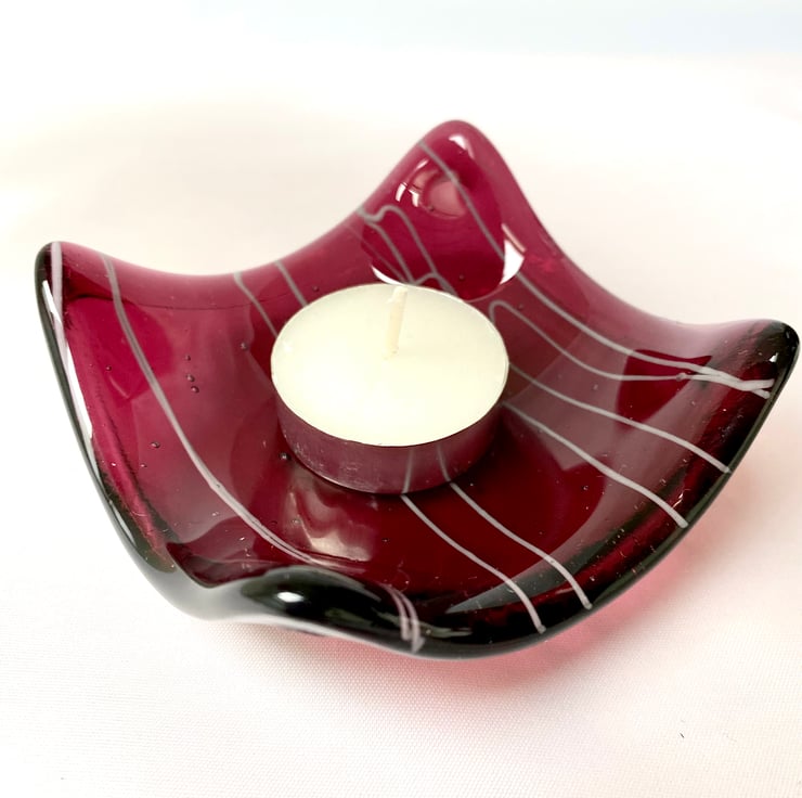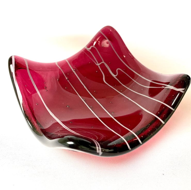 Measuring approximately 9.5cm square and 3.8cm high, this fused glass dish is perfect either for trinkets or as a tea light candle holder. The glass is transparent meaning it can cast a beautiful red glow when caught in the light.