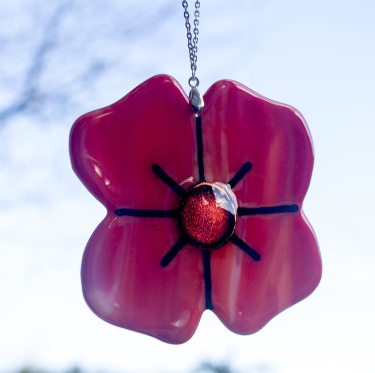 We have a series of Fused Glass Poppies in a selection of colours. This one is made from a streaky orange or pink glass with a shiny red centre.