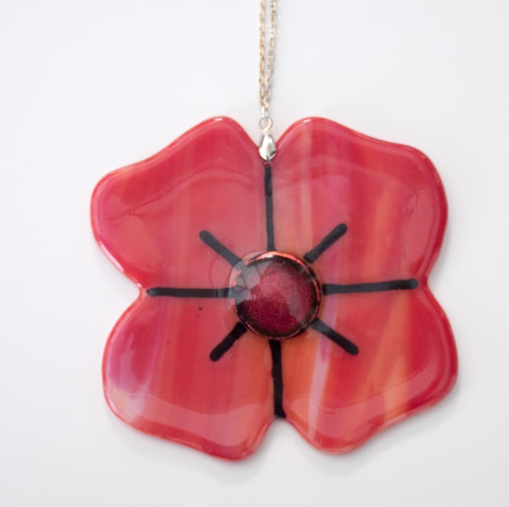 Each poppy is made from 4 hand-cut pieces of glass which are assembled with a pre-fused glass dot and glass rods to make the patterns. A 12-hour program of heating and cooling fuses the glass together after which we drill a hole and fit a bail and the chain.