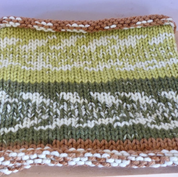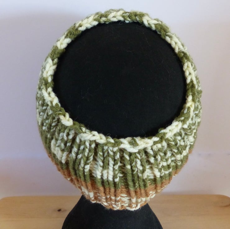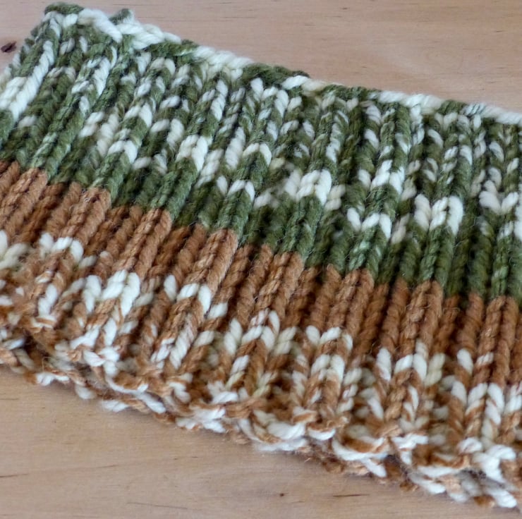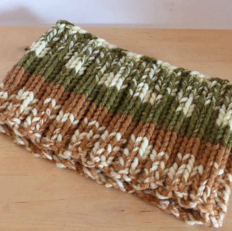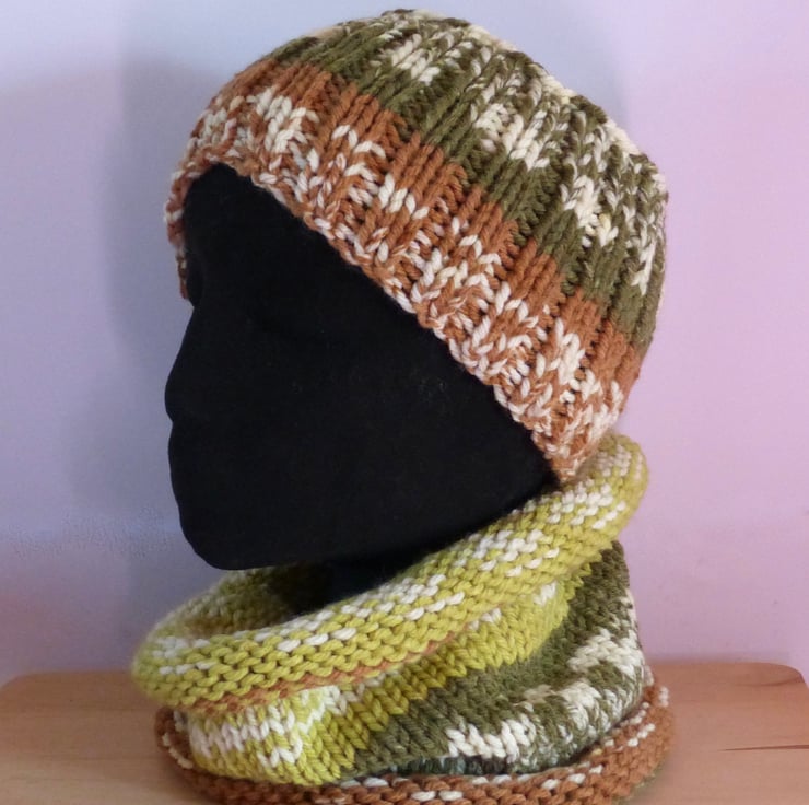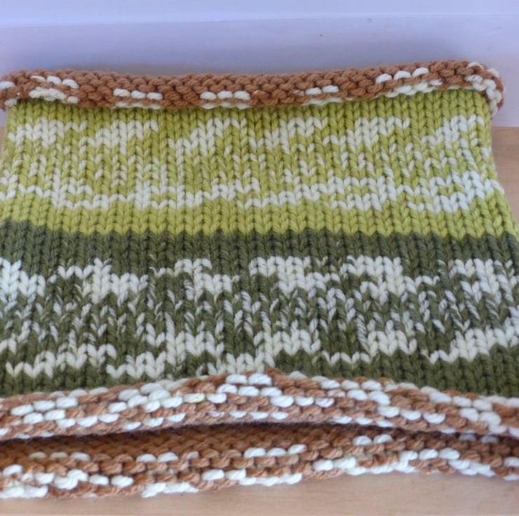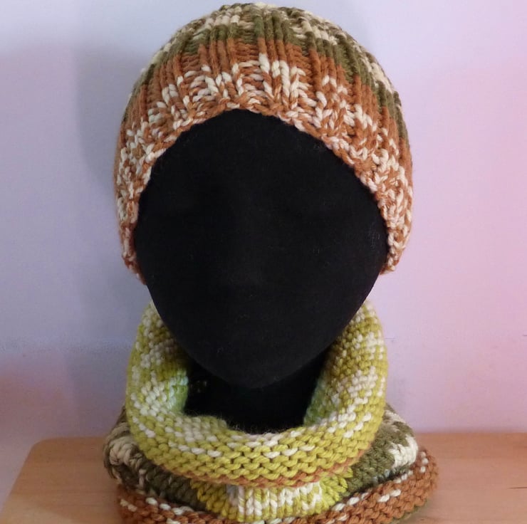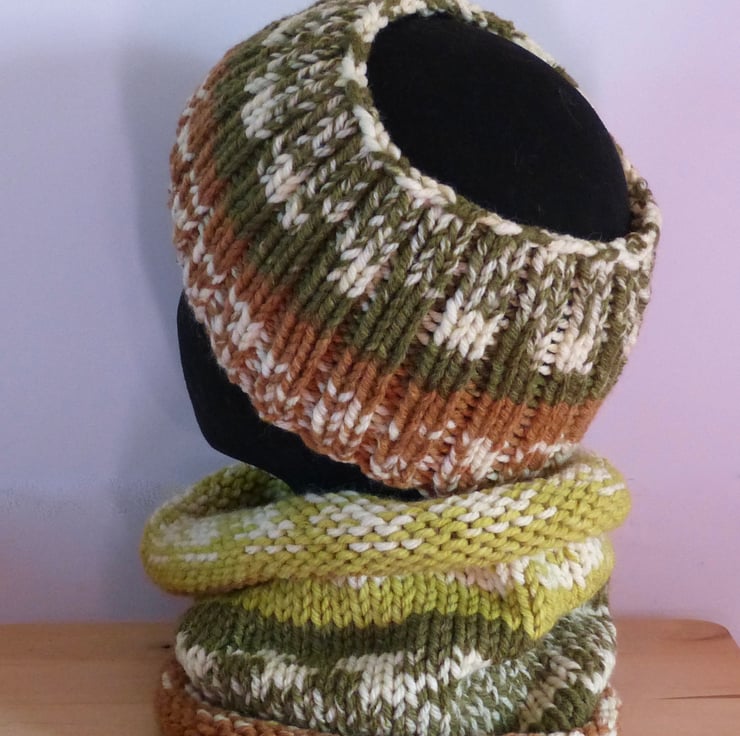 A hand knitted cowl and co-ordinating headband in a chunky 'Nordic' yarn which is 20% Merino wool and 80% Acrylic so it is lovely and soft and warm. The colours include Brown, Forest Green, Lime Green and Cream and it is self patterning in a random fairisle design.