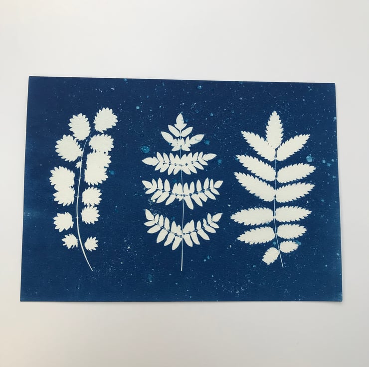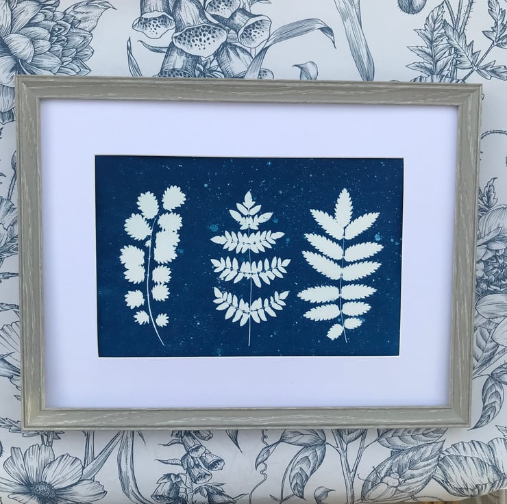 Original art- These three stems of foliage are sitting smartly on a bespeckled blue background, made using the Wet Cyanotype technique. This Photogram would brighten the corner of any room and attract some attention. Picked in the summer and pressed, the wildflower foliage accompanied by a slender stem of Fern, all behave well in the Cyanotype process. Why buy a print when you can buy an original piece of art? Free UK delivery