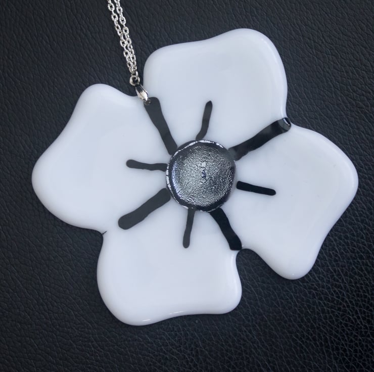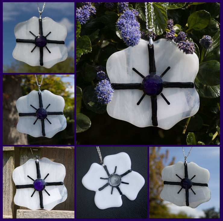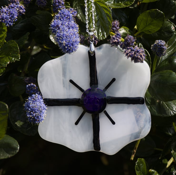 We have a series of Fused Glass Poppies in a selection of colours. This one is a white poppy, which represents Peace.