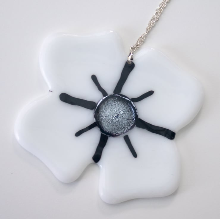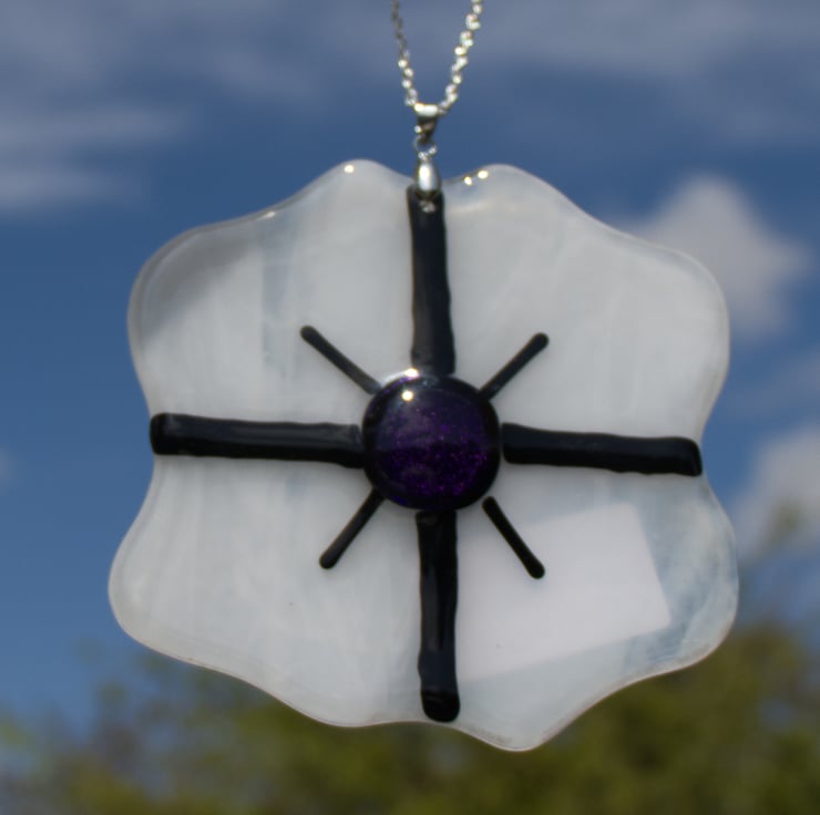 Each poppy is made from 4 hand-cut pieces of glass which are assembled with a pre-fused glass dot and glass rods to make the patterns. A 12-hour program of heating and cooling fuses the glass together after which we drill a hole and fit a bail and the chain.