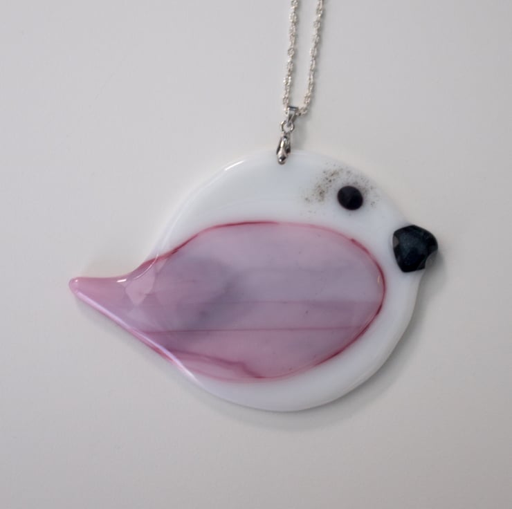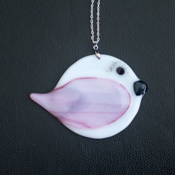 He is constructed from a circle of white glass as the main body, over which we position a specially cut piece of glass to make the wing. We add small pieces of glass for his beak and eye and pop him in the kiln for 12 hours. Once he's cooled down, we drill a hole, add a bail and string the chain.