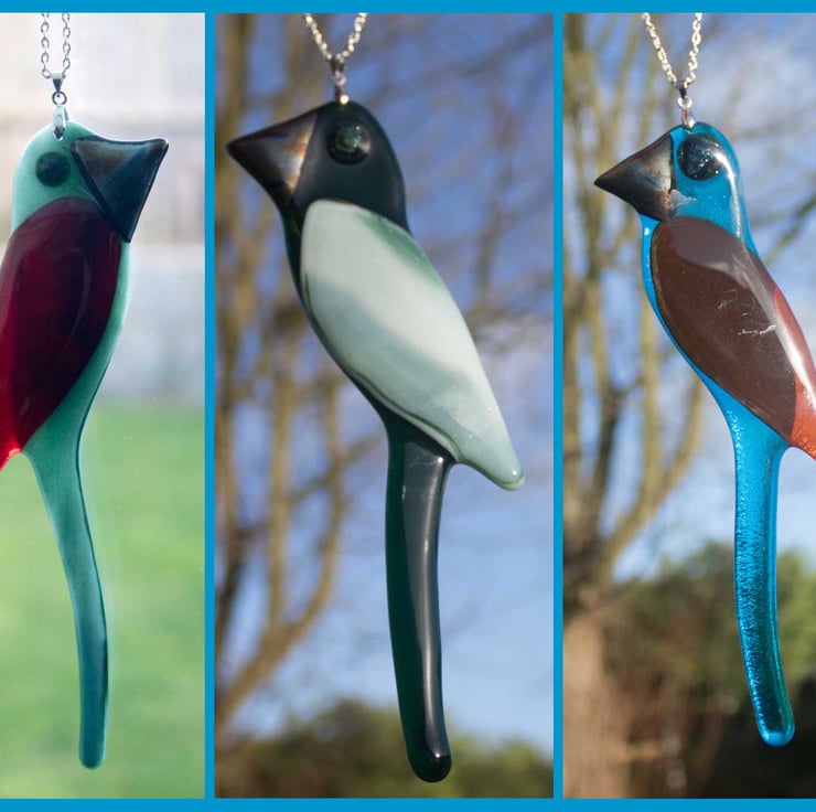 It is made from pieces of hand-cut glass that have been fused together to form the body, wings, and beak. A pre-fused glass dot is used to make his multi-coloured eye.