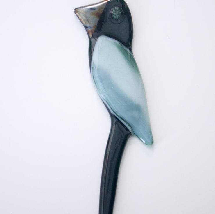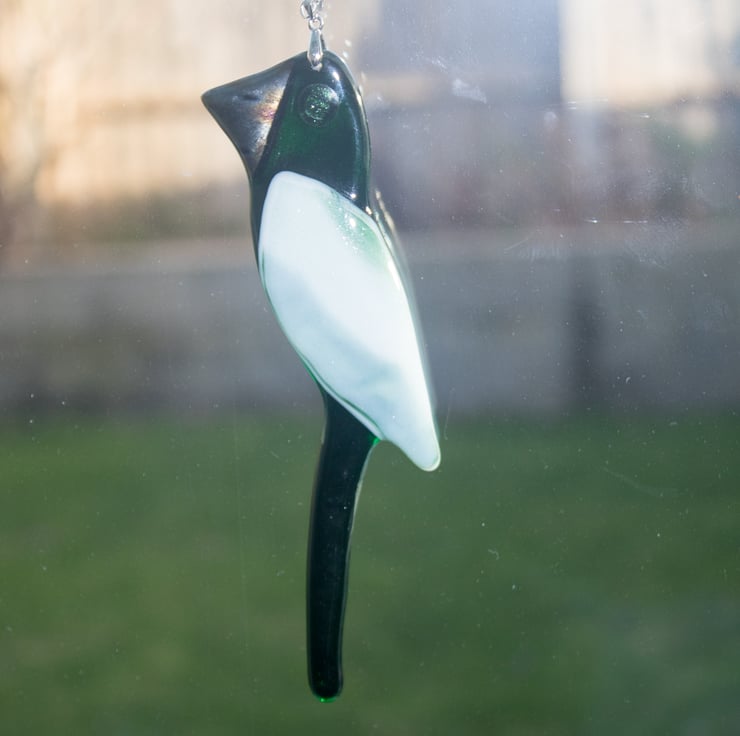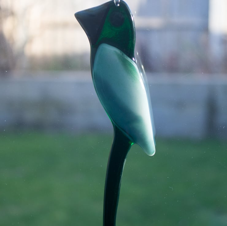 It is made from pieces of hand-cut glass that have been fused together to form the body, wings, and beak. A pre-fused glass dot is used to make his multi-coloured eye.