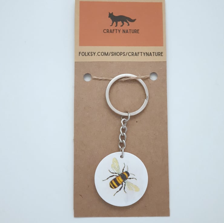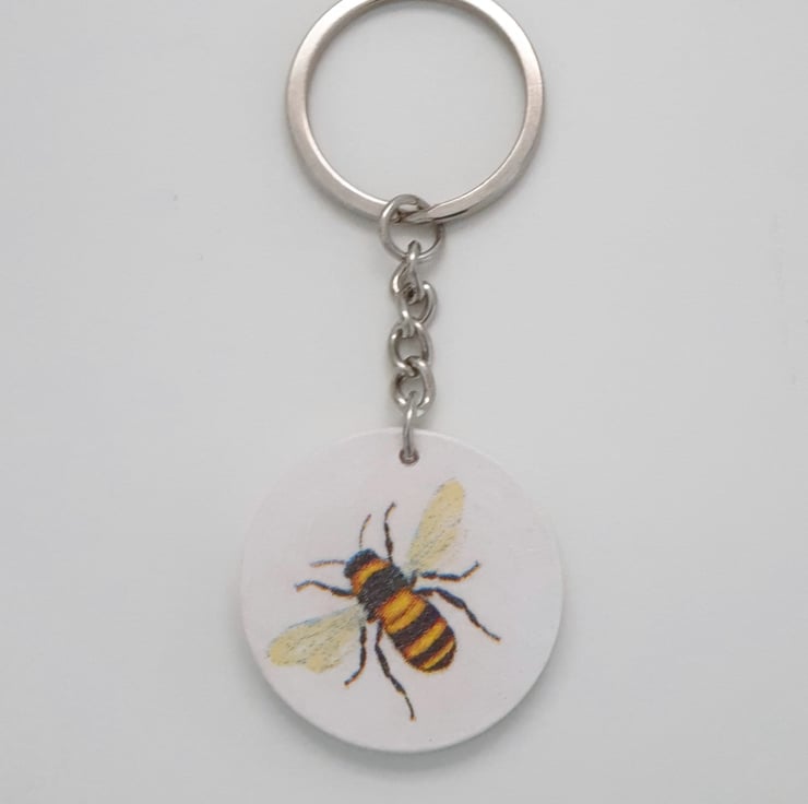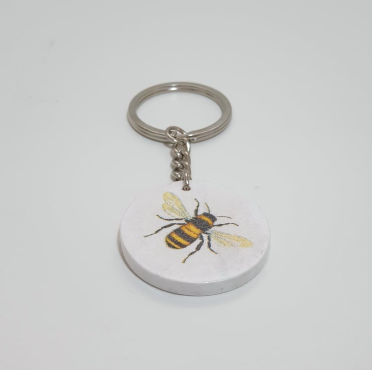 Double-sided round wooden keyring featuring a beautiful bee on each side. The wooden keyring has been painted white, decoupaged with the bees and varnished for protection and has a metal chain and ring.