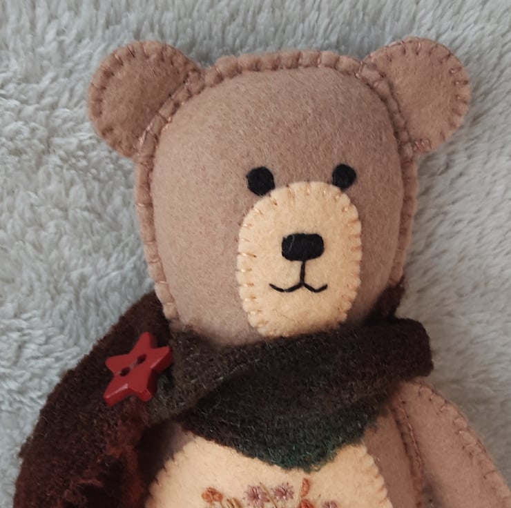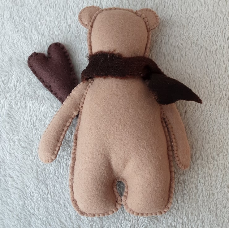 Teddy bear measures approx 8" tall, hand sewn from quality wool blended felt in a new simple, flat design. Each teddy bear has a contrast felt muzzle and tummy.