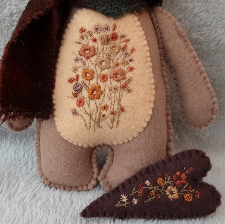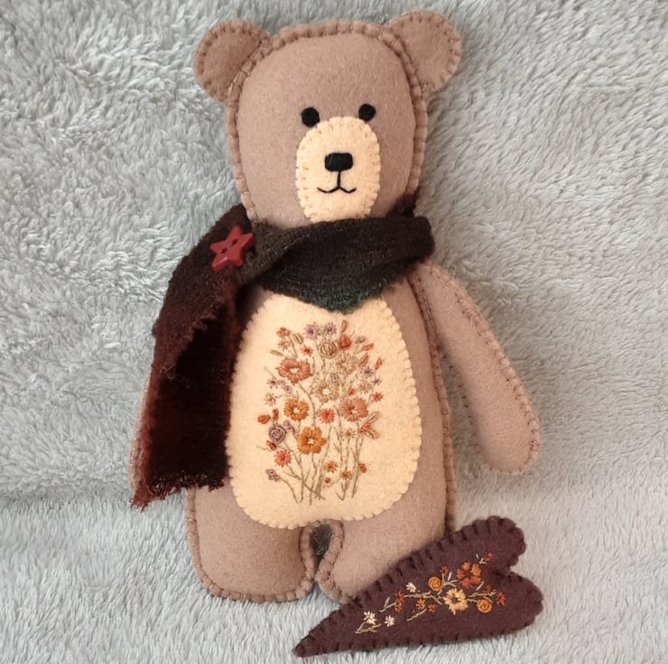 This one was sewn using mouse brown wool felt with beach sand contrast and has embroidery in lovely autumn golds, oranges and greens.