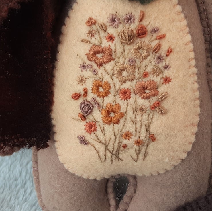 Each one is unique, no two embroidered areas will be the same and as they are completely hand sewn you can guarantee your chosen bear will be a one off gift.