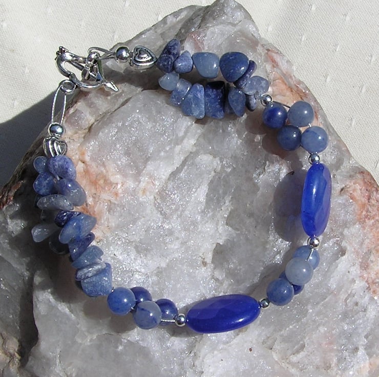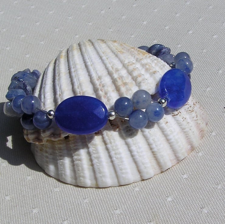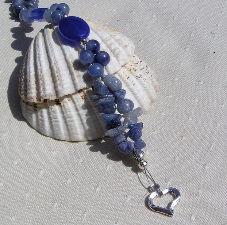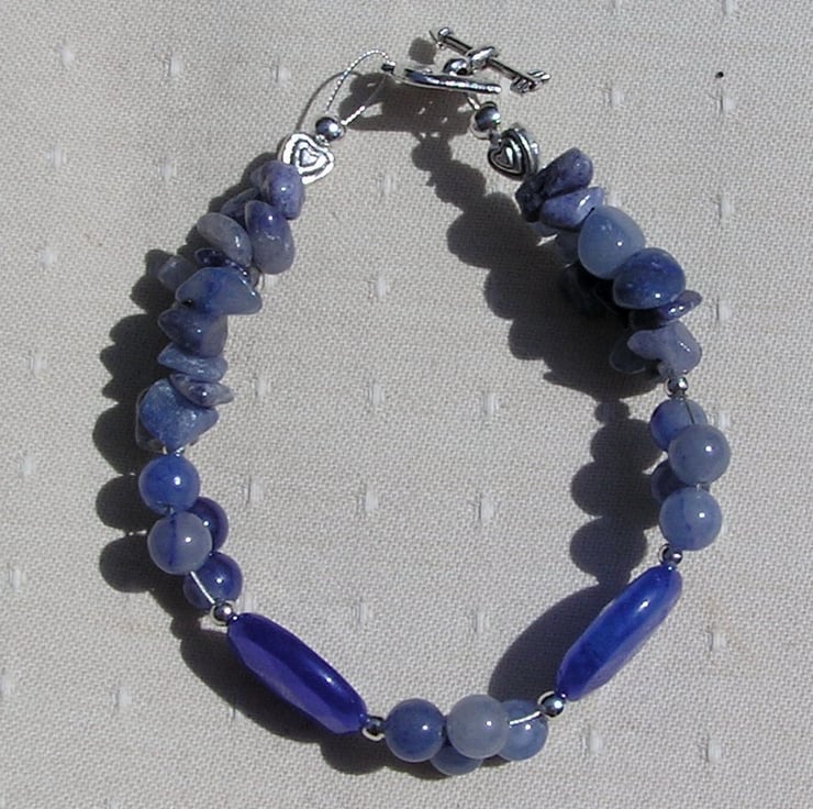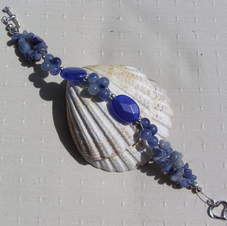 This Stunning Bracelet is made from Natural Blue Sapphire faceted Oval beads and Blue Aventurine round Beads, clustered together in groups of four which then flow into double-stranded Blue Aventurine Gem-chips, with a tiny Silver Heart at each end - a Serene combination that will look stunning either worn casually or with something more Elegant for a Special Evening out