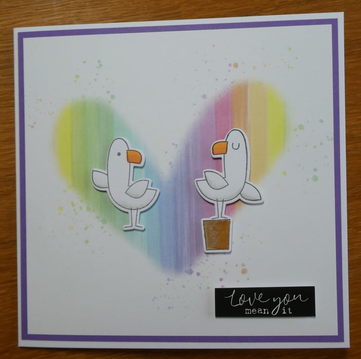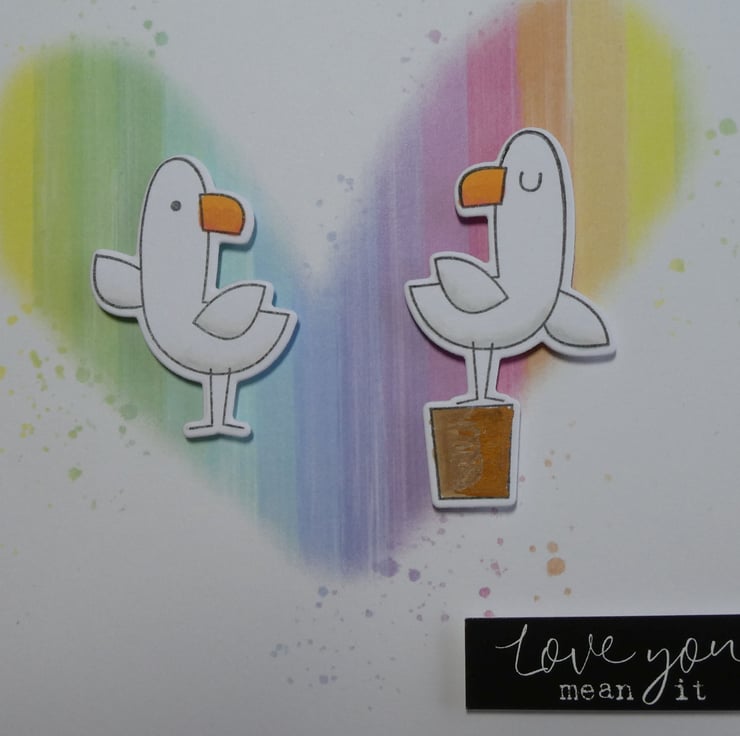 It features a pair of die cut gulls which have been hand stamped and inked and slightly raised above a printed image of a bright rainbow heart surrounded by ink splatters.