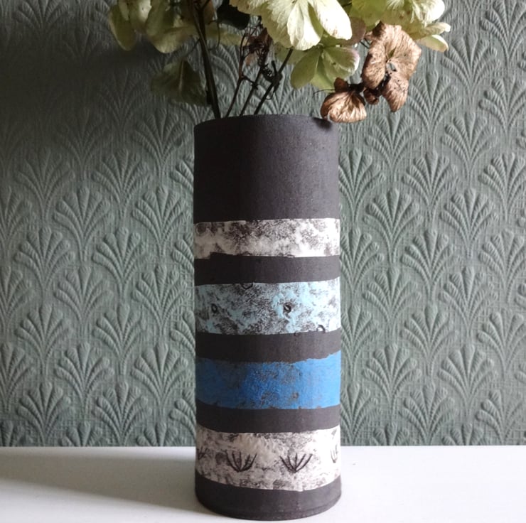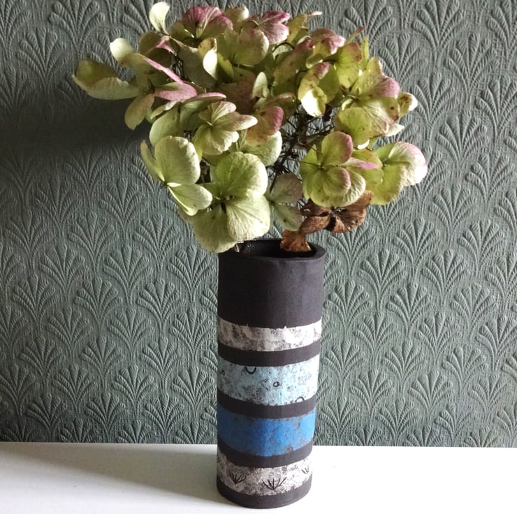 I chose banded stripes of colour in blue, grey and white pastel shades to decorate this vase, a look to suit your lifestyle and modern home furnishing styles. The vase can show off informal arrangements of garden flowers, wildflowers or grasses, fresh or dried, and gives a lovely light and fresh feel to your rooms. From the base to the top the colour scheme goes from grey to dark blue to light blue to white. The bands feature incised motifs (a technique called sgraffito) of small seed-like circles and grasses, and I mark these into the colour to reveal the grainy black clay beneath. Inside the cylindrical form I have used an iron lustre glaze which fires to subtle shades of very dark blue, mustard and russet. The overall shape I form with my hands, folding a sheet of clay into a soft roundish shape before firing twice to a very high temperature in my kiln. Approx. size is 15.5 cm high and 6.5 cm across the base at the widest point.