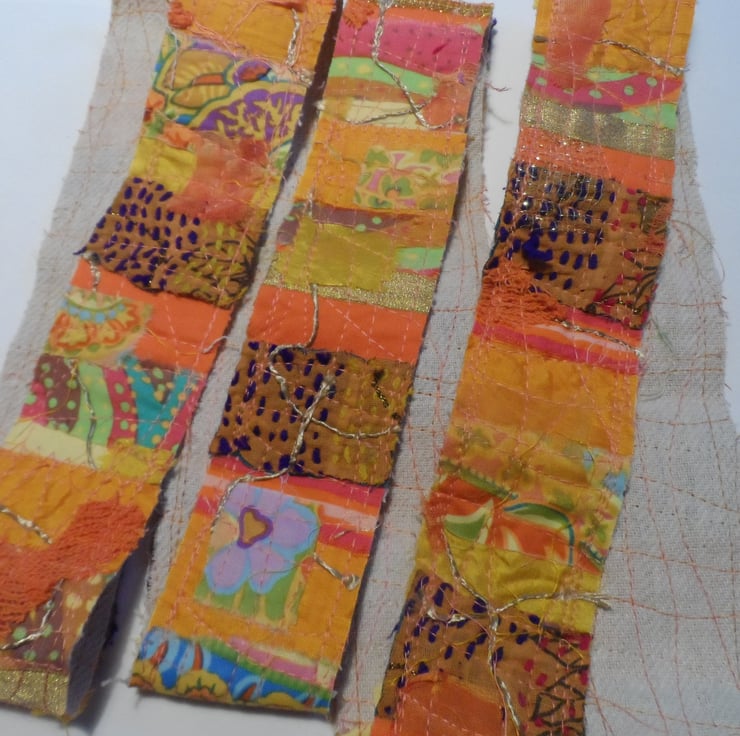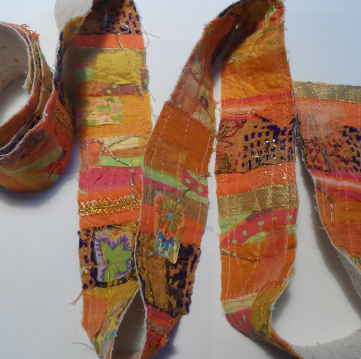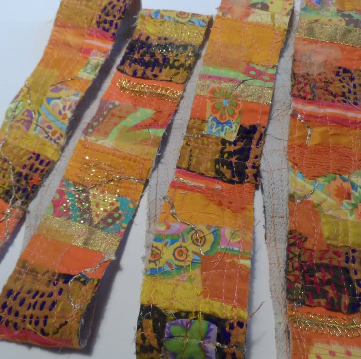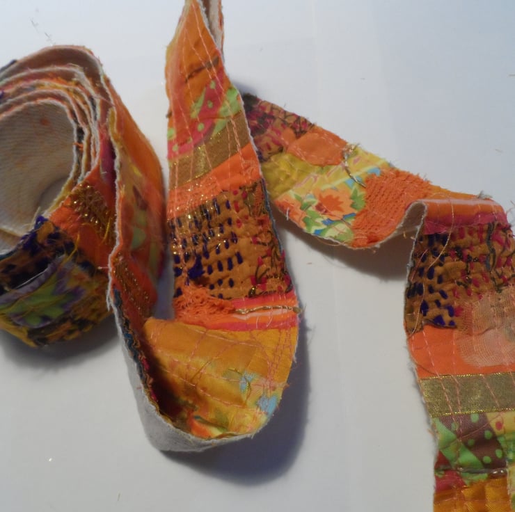 This is a handmade made snippet roll made from a wide range of coordinating fabrics including sari ribbon, kantha cloth, gold braid, cotton fabric, and ribbon. The fabrics are sewn onto a backing of cotton fabric and machine stitched into place. The main colours are orange and yellow, with small amounts of green and purple, and some gold accents.