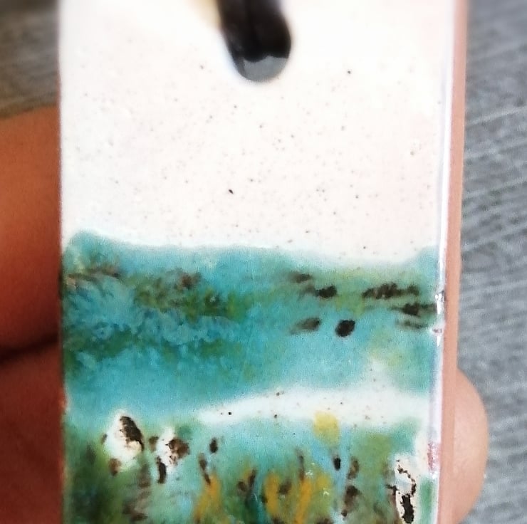 After firing the necklace pendant is ready to paint with various Earthenware glazes and oxides depicting and evoking the local landscape with lines and textures, before receiving a glaze firing, giving a smooth glossy feel to the surface and a matt terracotta on the reverse.