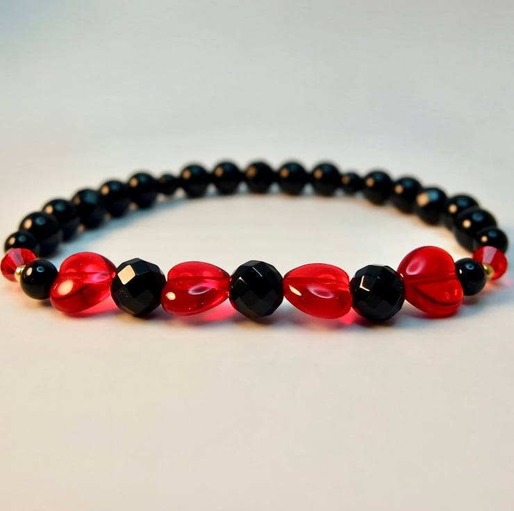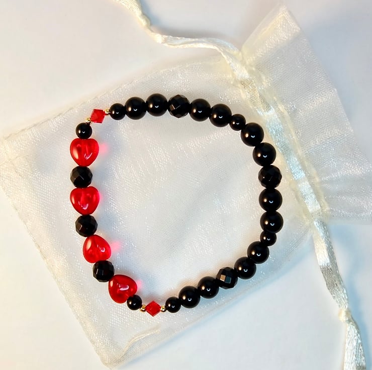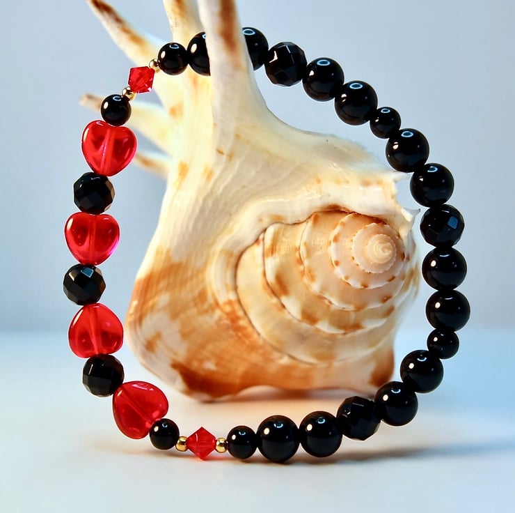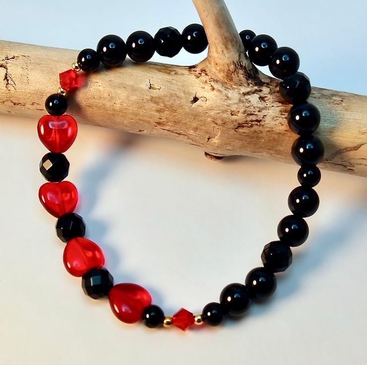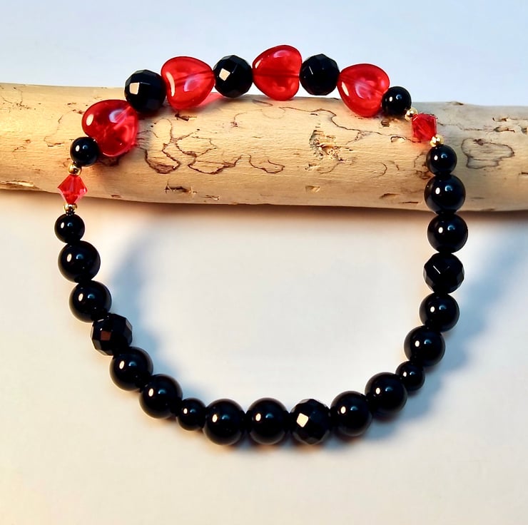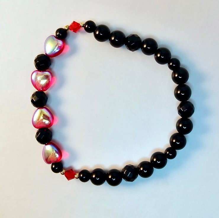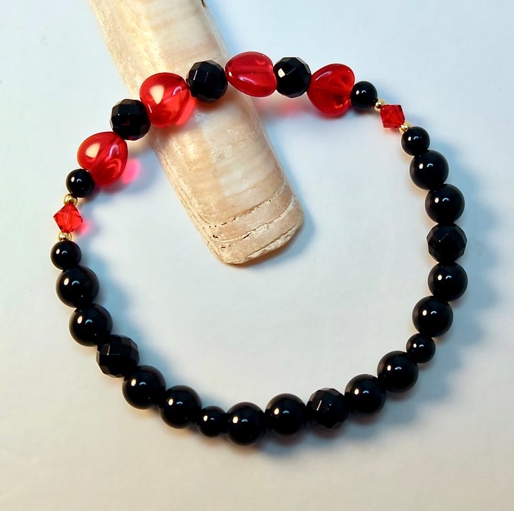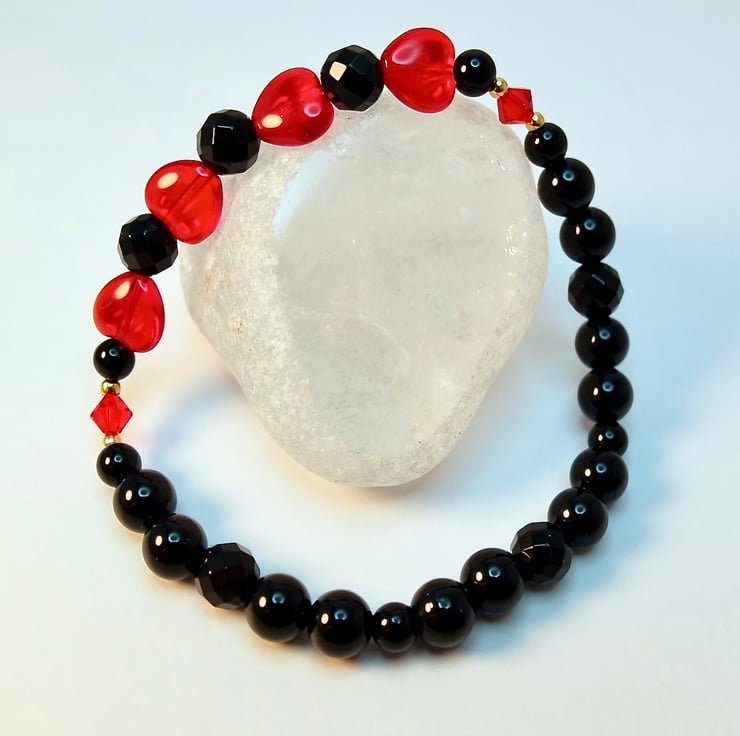 Striking black and red stretch bracelet made from four 8mm Czech 'Siam Ruby' glass ab hearts, separated by 6mm faceted black Onyx beads and bracketed by 4mm Swarovski bicones in the colour 'light Siam'.