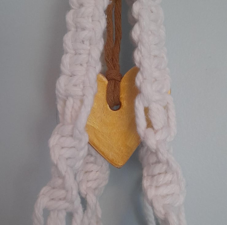 Handmade macrame hanging basket with centrally hanging handmade air dry clay heart embellishment. Made from recycled 3-ply twine. Brown knots added for contrast.
