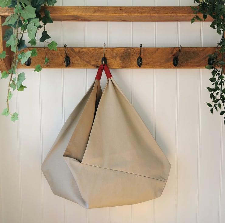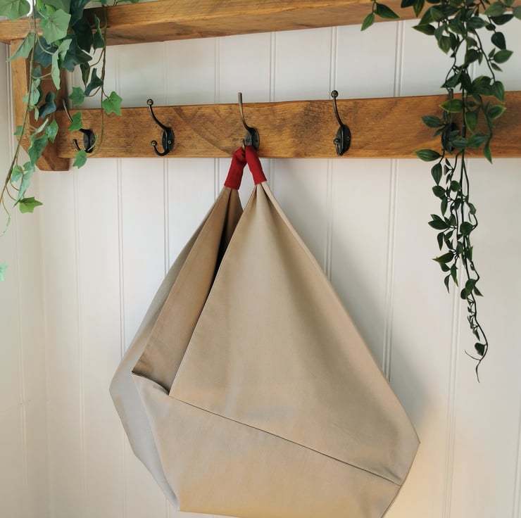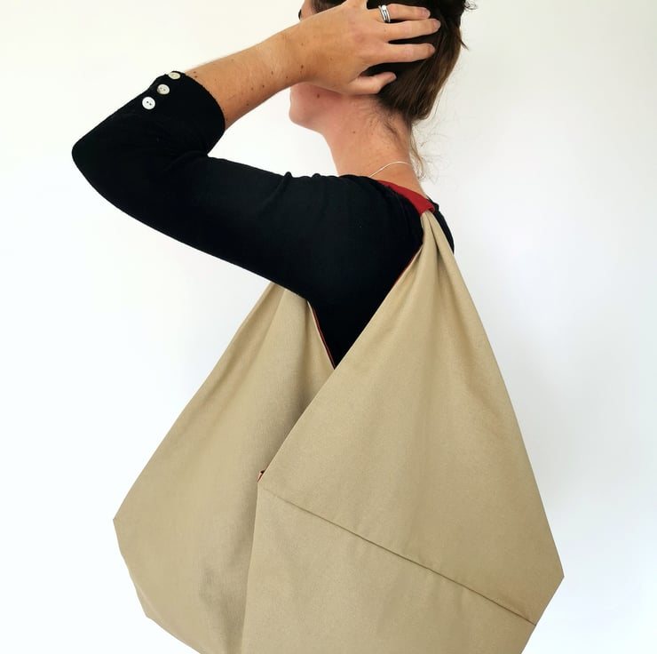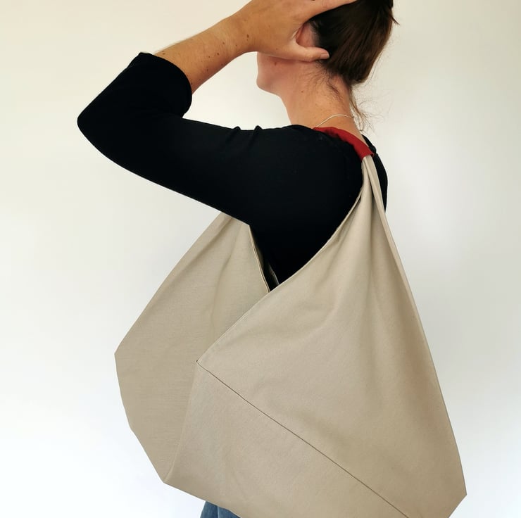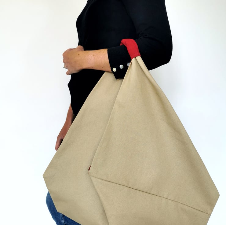A large origami design shoulder bag made of natural/beige 100% cotton canvas fabric, lined in taupe/mushroom 100% cotton with a raspberry red 100% linen handle. The colours go beautiful together - so light, airy, natural looking and the raspberry handle gives a lovely pop of colour!