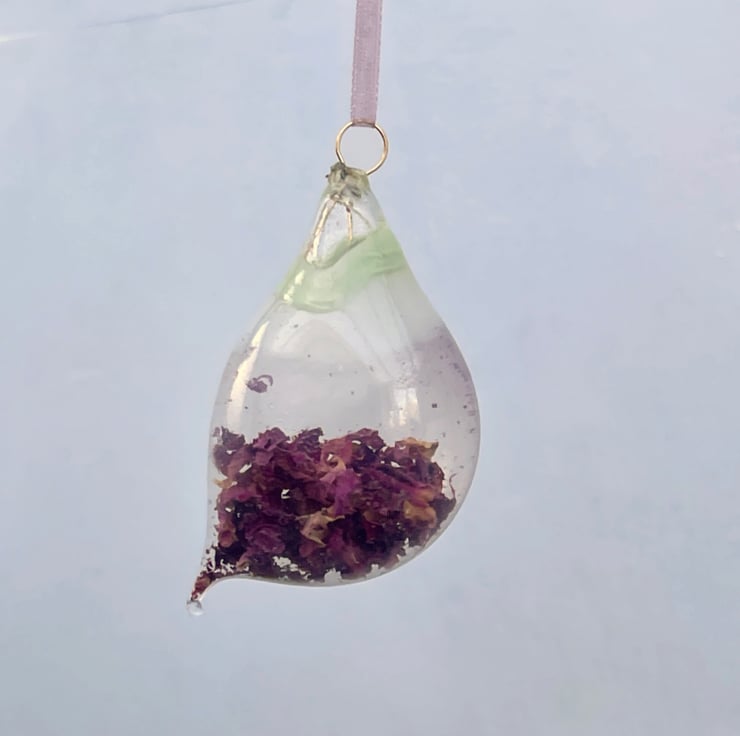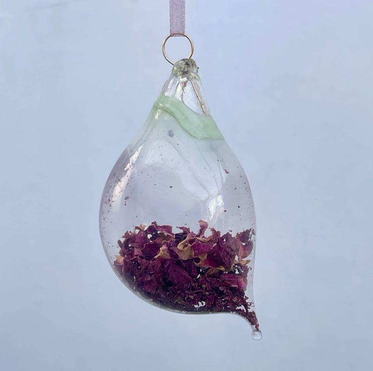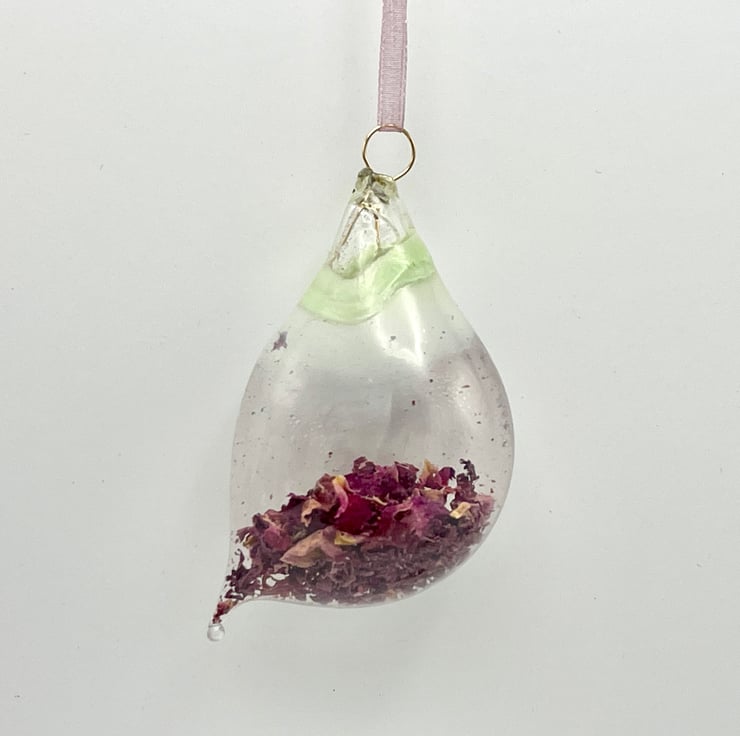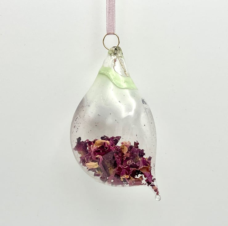 Gorgeous gift boxed blown glass bauble holding rose petals. Perfect for Valentine’s Day!
