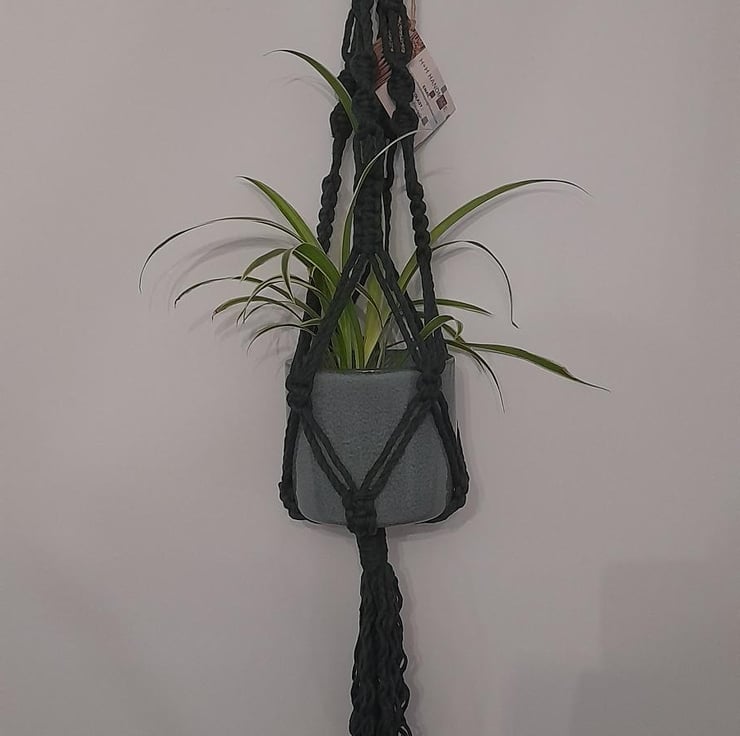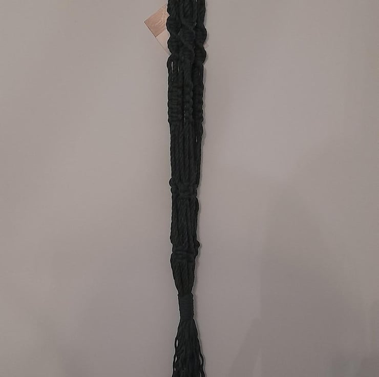 Handmade macrame hanging basket in green cotton twine, measuring approximately 75cm.