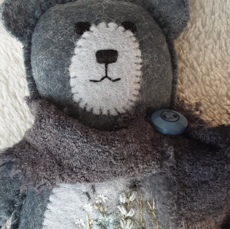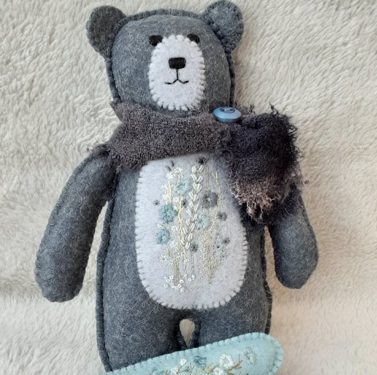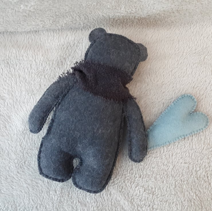 He wears a wool scarf cut from hand dyed wool boucle and finished with a little button and comes with a blue hand embroidered heart embroidered in similar styles.