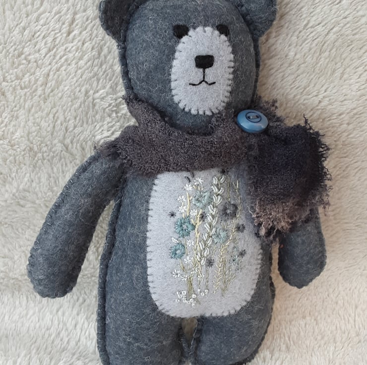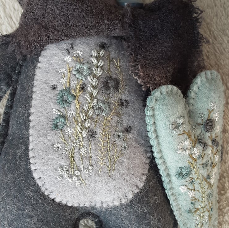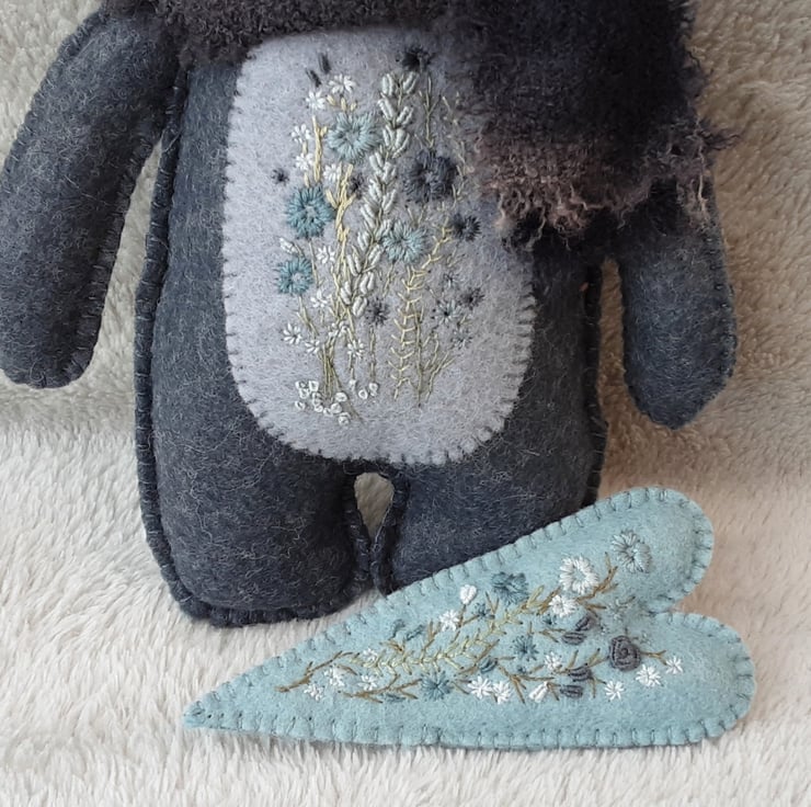 This one was sewn using charcoal grey wool felt with pale grey contrast and has embroidery in blue and grey tones.