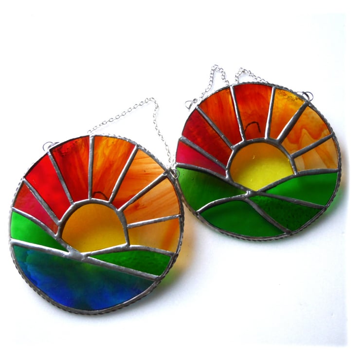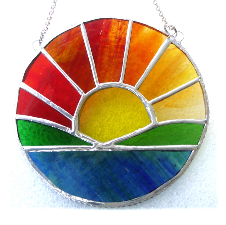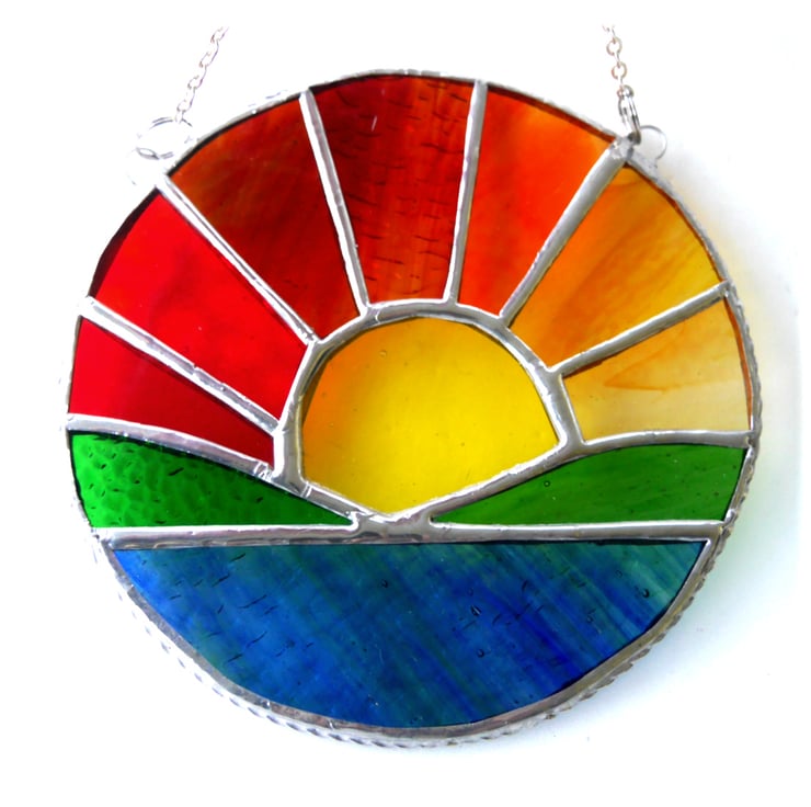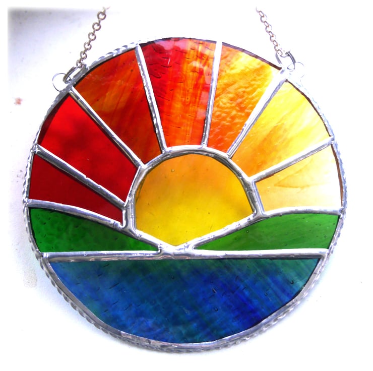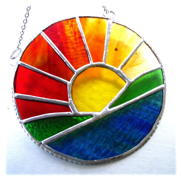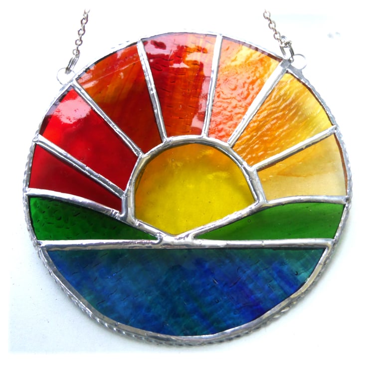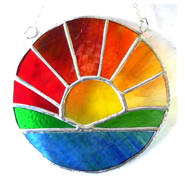 The sun's rays are made from 7 different colours and textures of red, amber and yellow glass with lots of streaks to denote the rays.