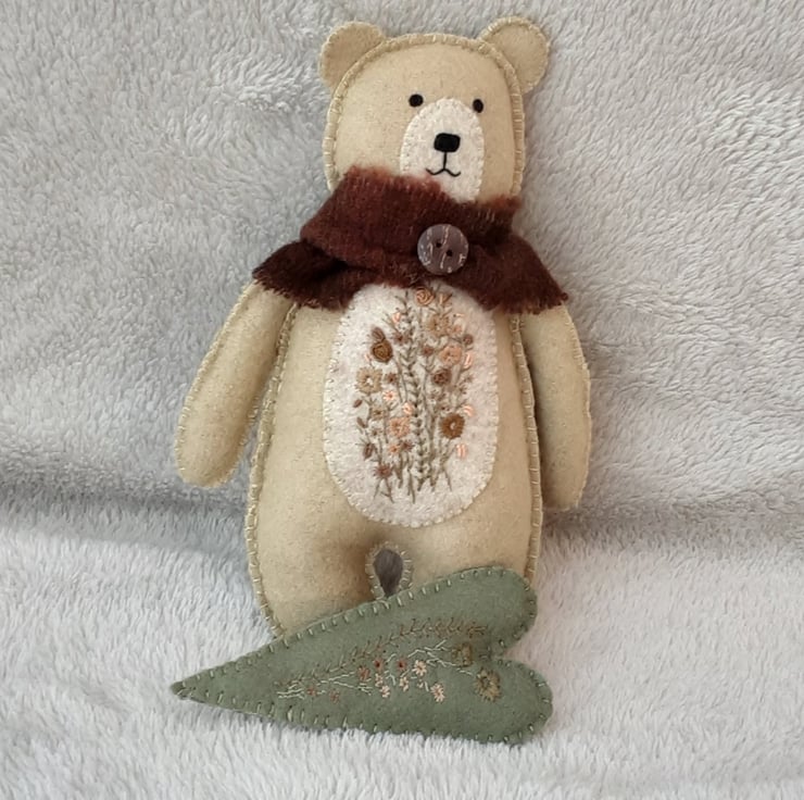 A hand embroidered and hand sewn teddy bear and heart, keepsake gift