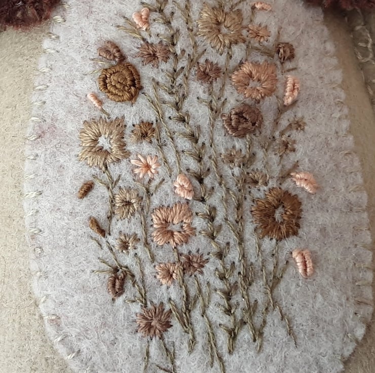 This one was sewn using a pale soft green moda felted wool and has embroidery in Autumn golds, greens and oranges.