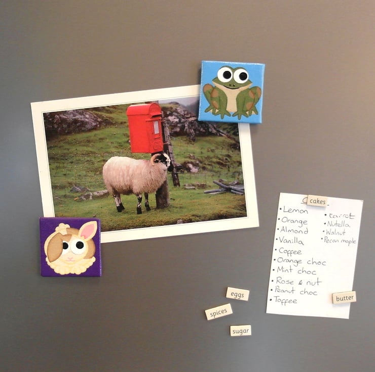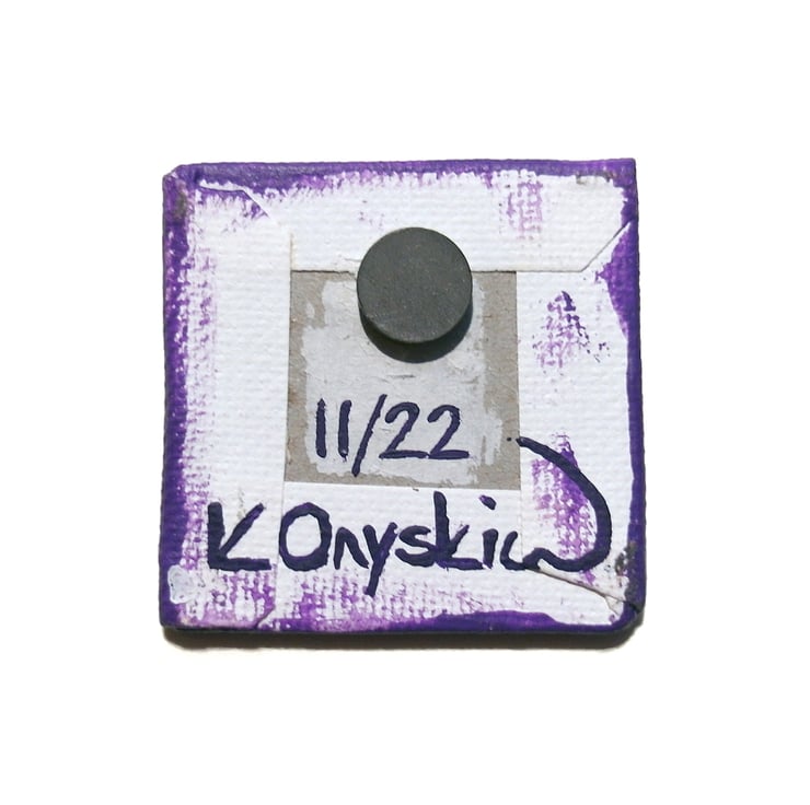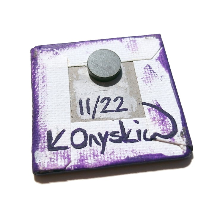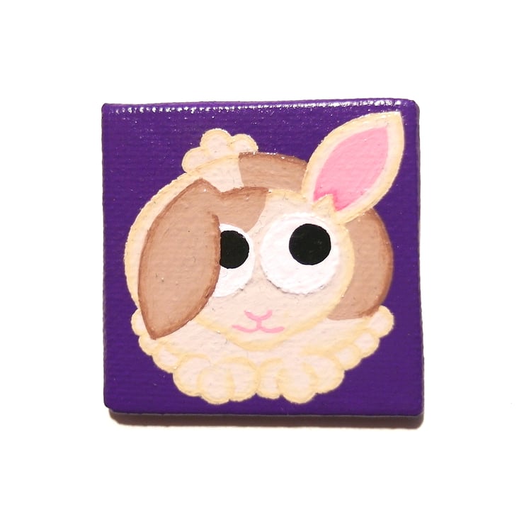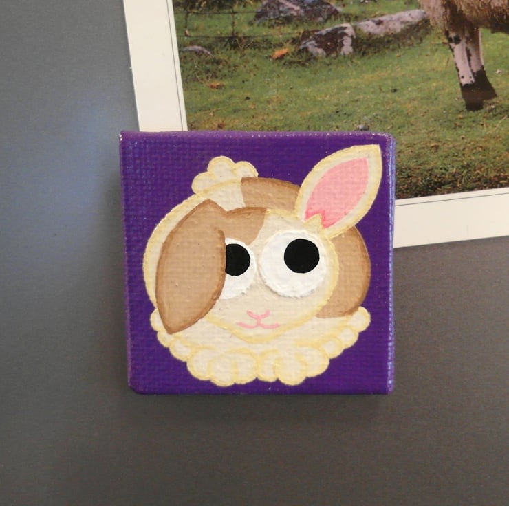 The rabbit is painted in acrylics on a small 5cm x 5cm (2" x 2") canvas board, The original piece of art has been coated with a layer of clear varnish to make it more durable, and a 12mm magnet is attached to the back so the painting can stick on a fridge or other magnetic surface.