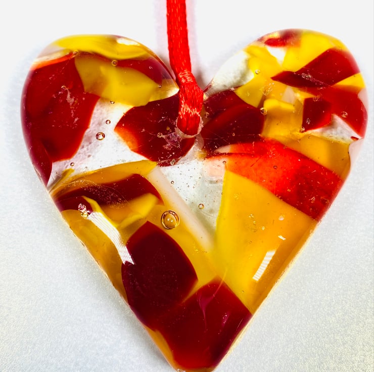 Perfect fused glass hanging heart for valentines . These pretty cast hearts are made using recycled glass . They are approximately 3.5 inch diameter and 1/4 inch thick drilled and strung with ribbon ready to hang . Shades of red , gold and yellow . Perfect to hang anywhere in your home