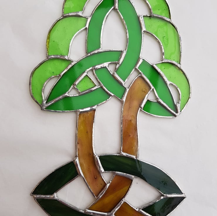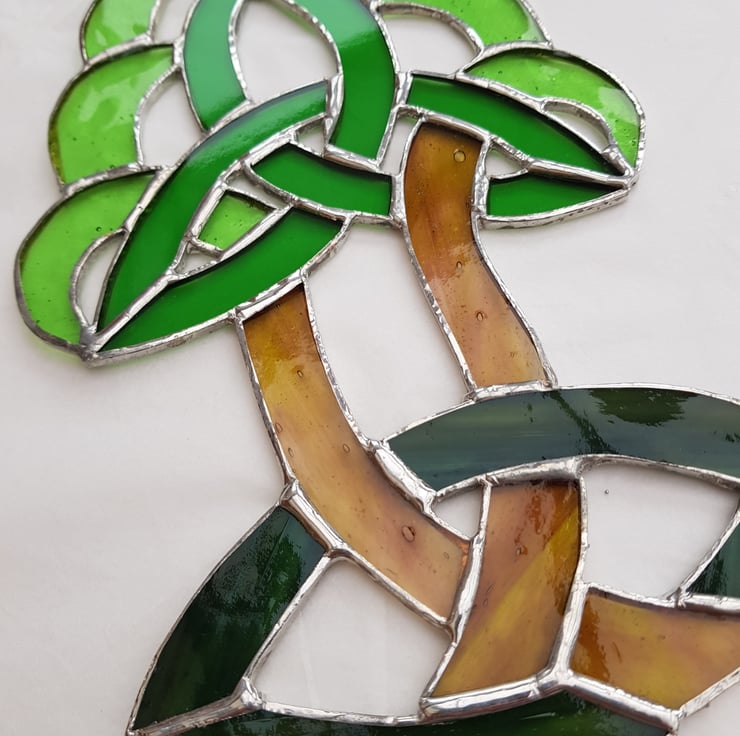 The Celtic Tree is created using the copper foil technique. The glass is cut to shape, the edges are smoothed using a grinder, copper foil is put round each piece and the the pieces are soldered together.