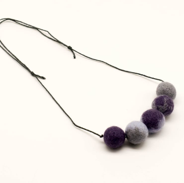 This statement necklace has been created using five felted beads made from shades of purple and grey merino wool and strung on dark grey 1mm hemp cord.