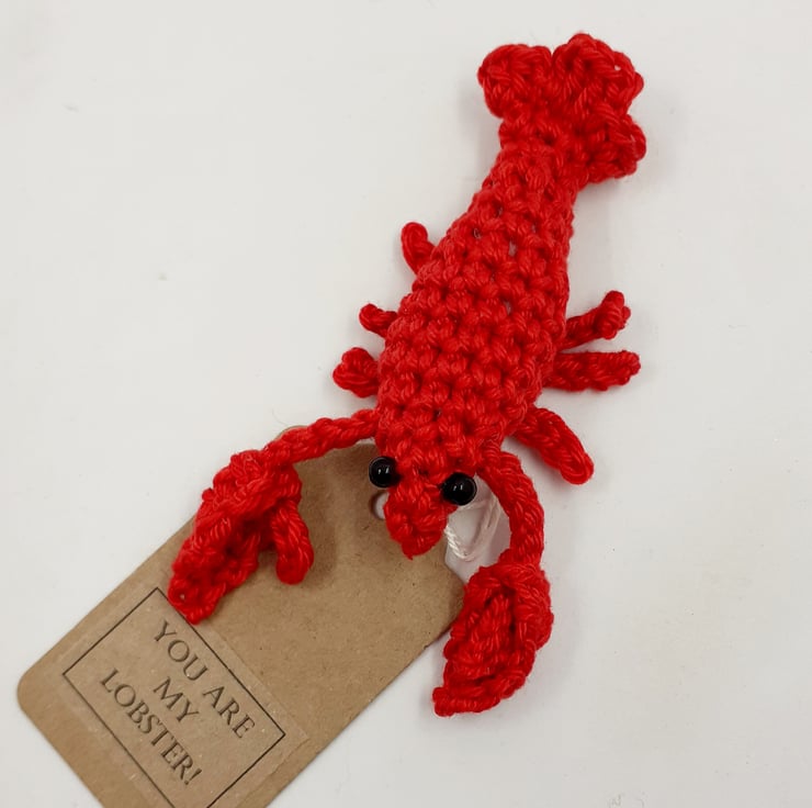 This tiny, romantic lobster is all set to deliver a message on your behalf. It is crocheted in cotton from a pattern by Kara Lyon at www.karabouts.com. It is filled with polyester stuffing and has beady black eyes. It carries a tag which reads 'You are my lobster!' although I am very happy to exchange this tag for one with wording of your choice.