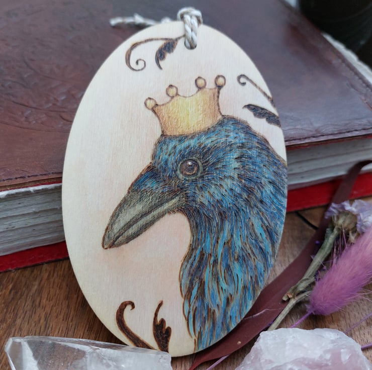 This beautiful crow, with his thoughtful expression, is created using pyrography, burning on wood, and coloured using acrylic ink and coloured pencils. It is finished with linseed oil.