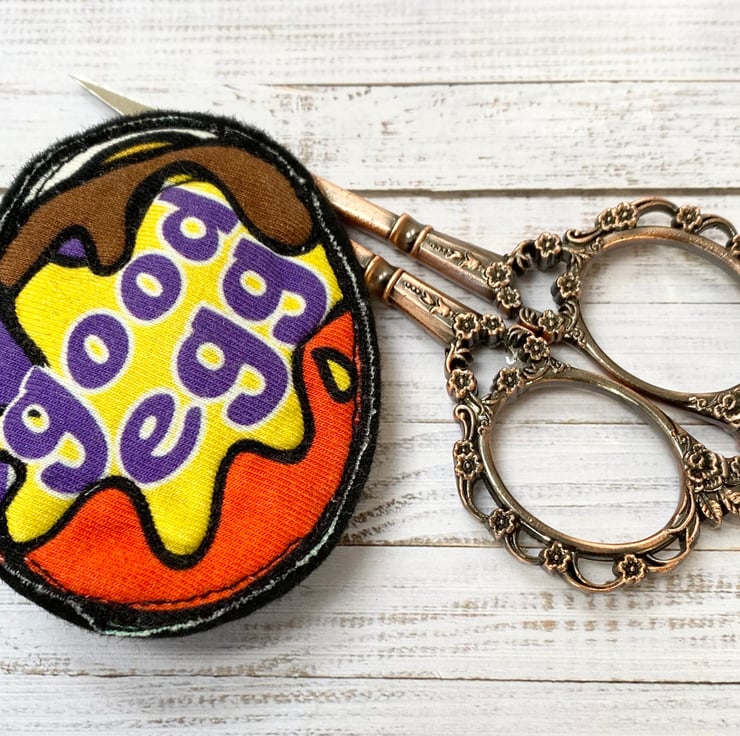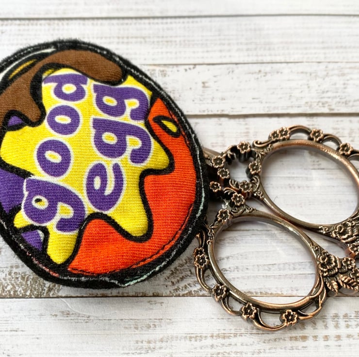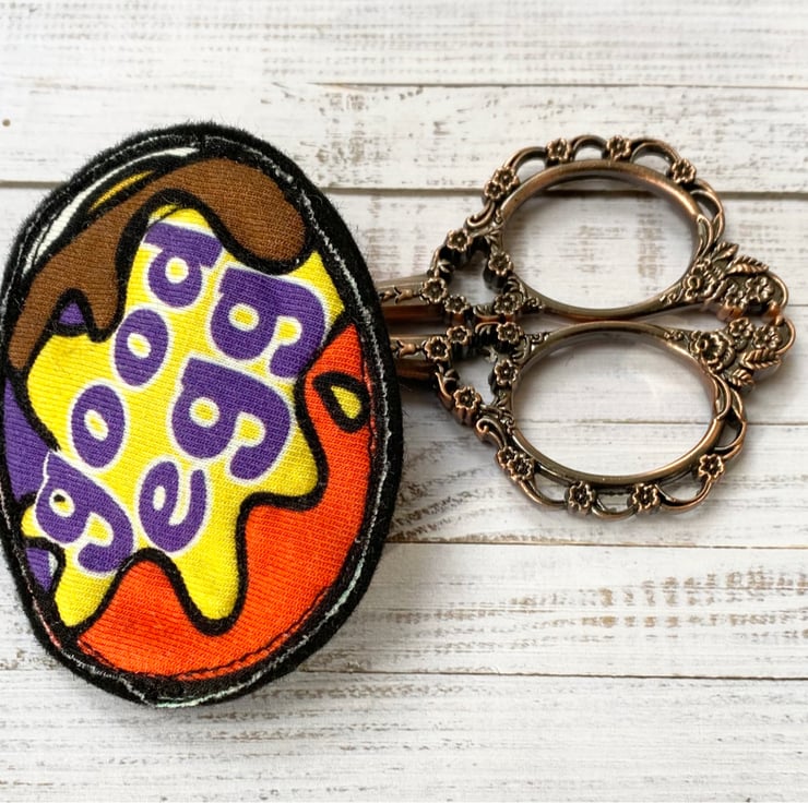 This fun handmade free motion embroidered chocolate egg brooch is made from up-cycled fabric. It is felt backed, and has a brooch pin with a catch on the reverse to keep it nice and secure. It measures 5 x 7cm approx.