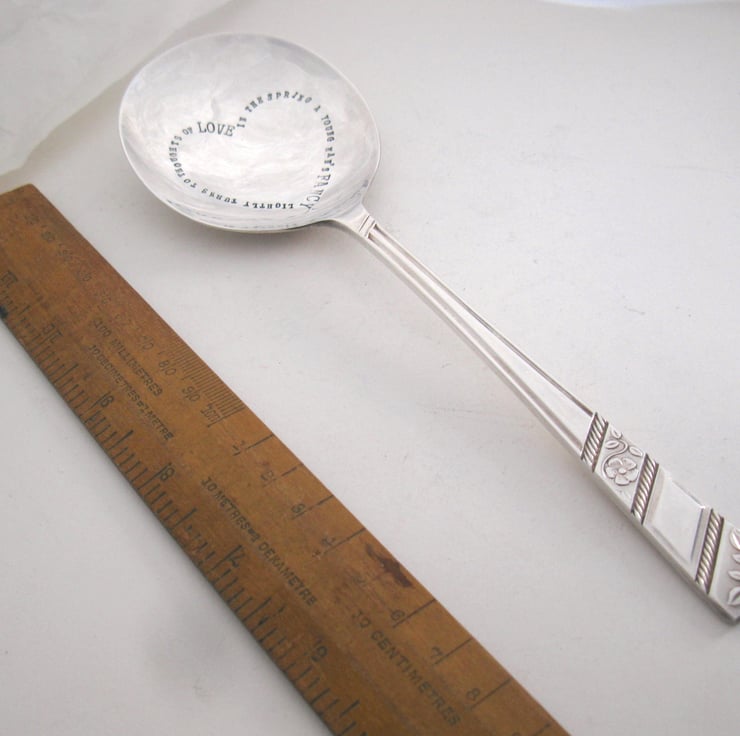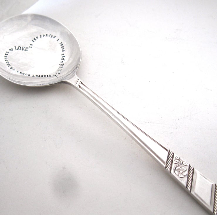 A large round shallow serving spoon or tablespoon with a floral handle, hand stamped with the quote 'In the spring a young man's fancy / Lightly turns to thoughts of Love' with the wording forming a heart shape.