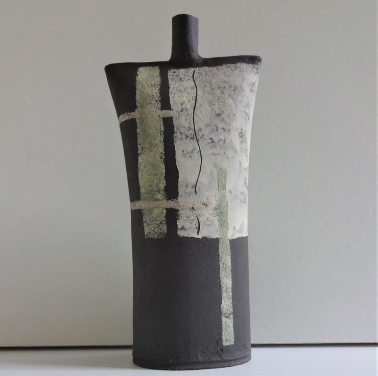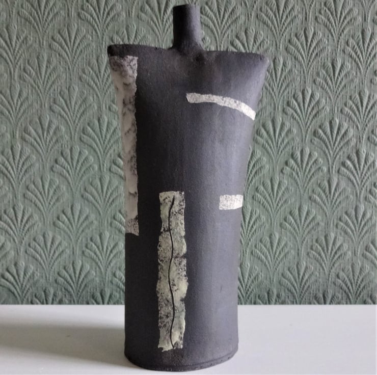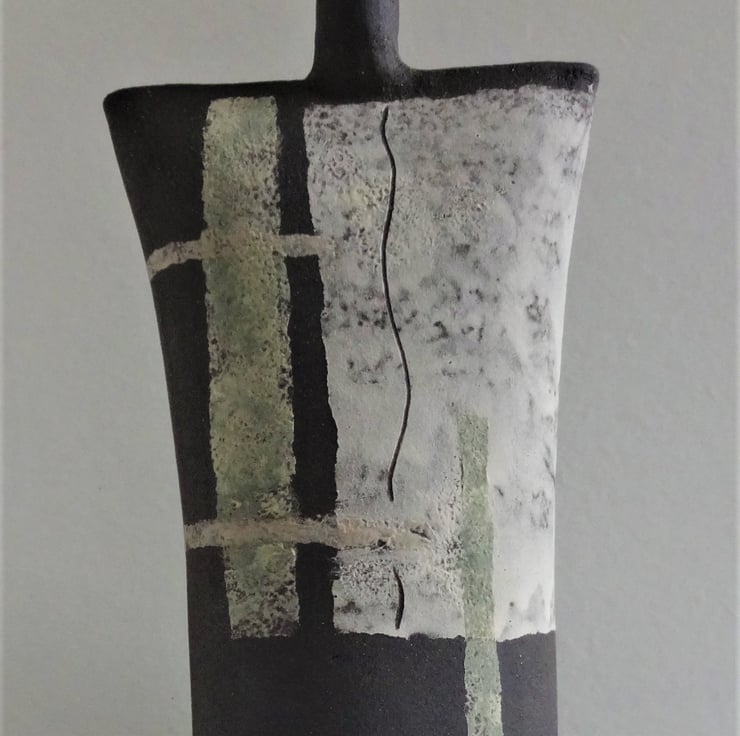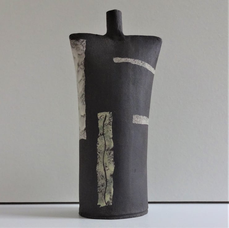 An abstract sculptural ceramic with echoes of the human form, ‘James’ is from my Kindred Collection and makes a striking focal point in your living space. Kindred pieces can also be used as a focus of contemplation during yoga and mindfulness meditation, their simple forms promoting a receptive mindset for practice. I created the piece from black stoneware clay, and added decorative panels and motifs in muted shades of grey/white and two tones of green. There are different but related motifs back and front of the form. As a finishing touch I used the sgraffito technique to score a curving line through the colour in two places to reveal the natural matt black clay beneath. Each piece in the Kindred Collection is different because each is entirely handmade – I don’t use moulds or transfers. So, each has a personality of its own, and a name, this one is James. 19cms high.