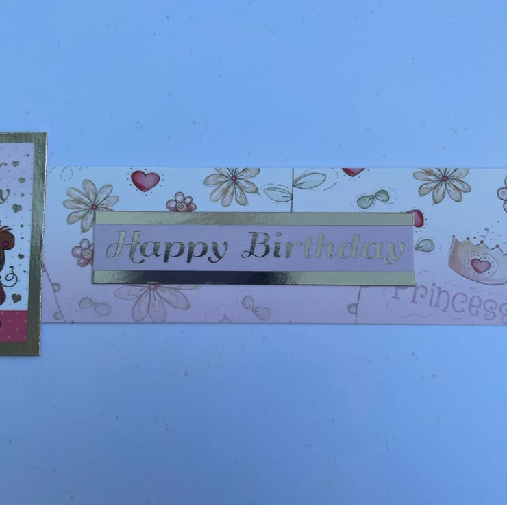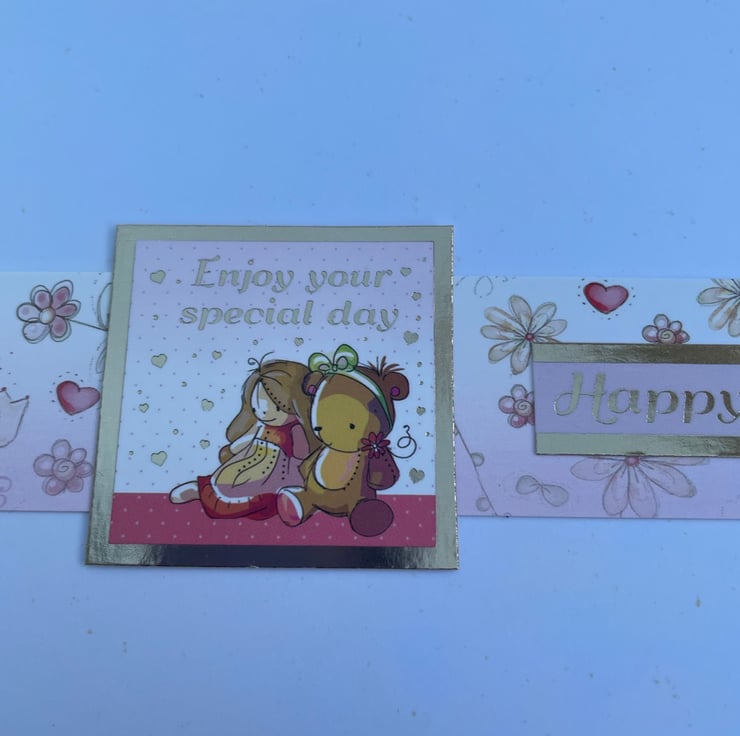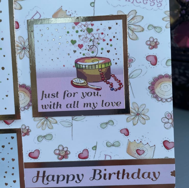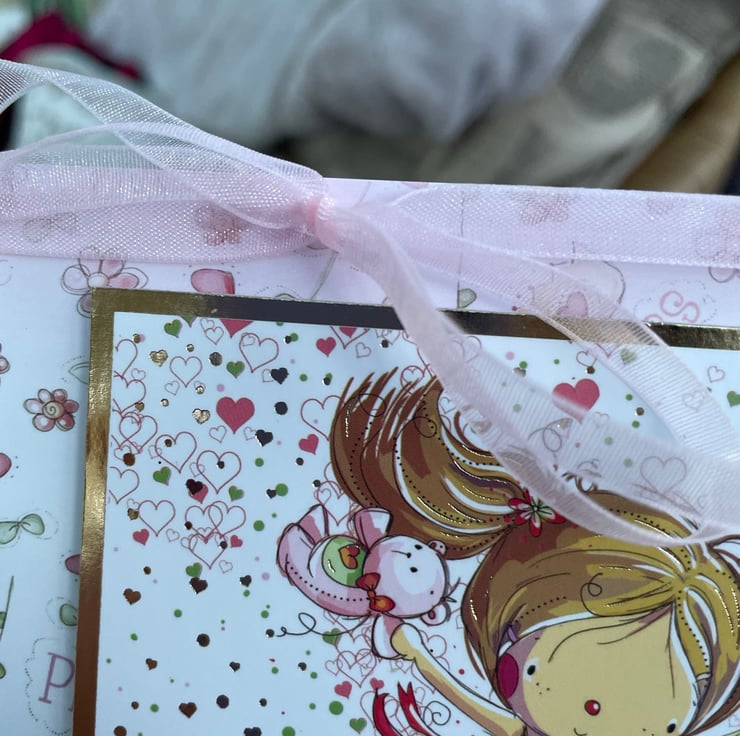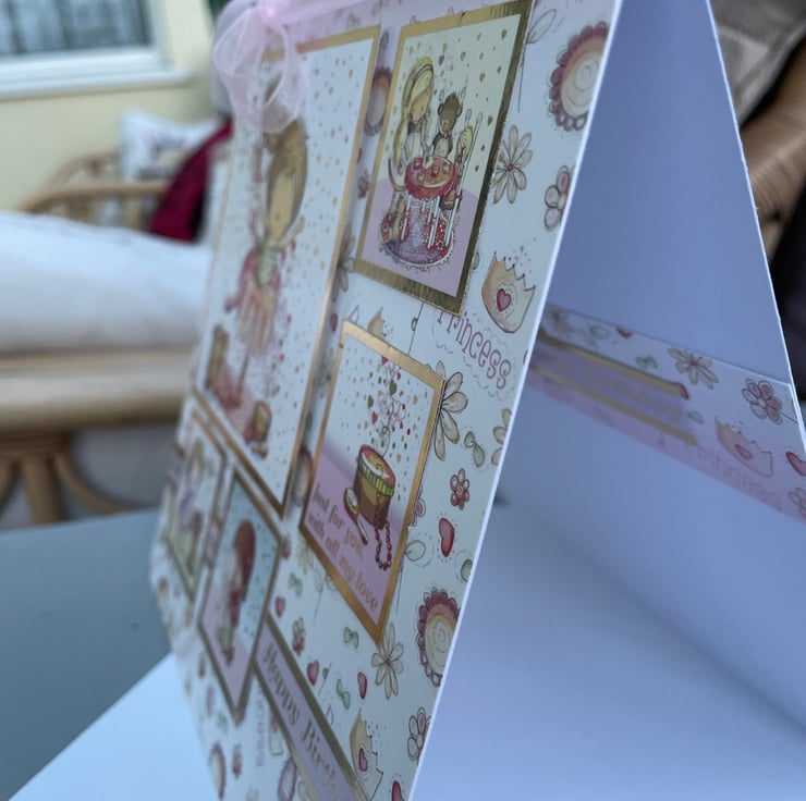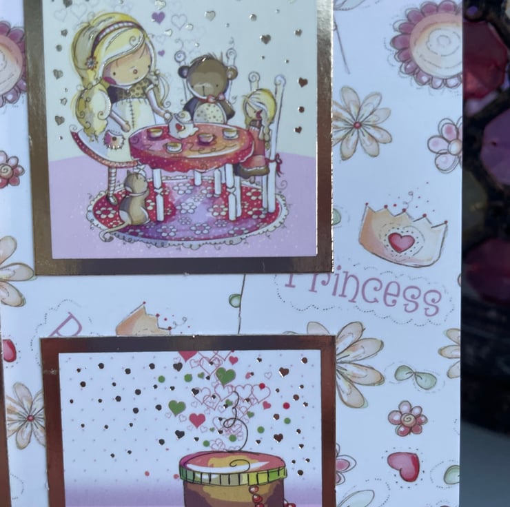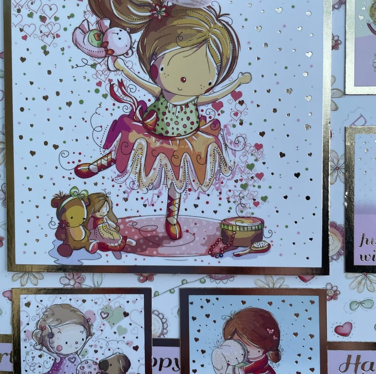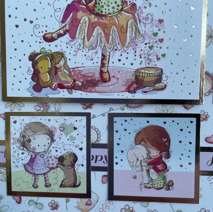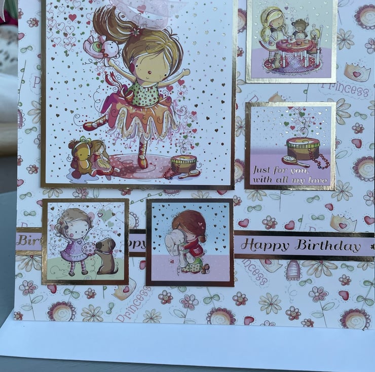 A cute and quirky card for a special little girl. This 17.5x17.5cm card makes a beautiful greeting for a little girl. It is quirky and cute and features a little girl having fun with many activities. She is dancing, playing with her dog, having a tea party and playing with her toys. The greeting says Just for you, with all my love and Happy birthday. Inside the card has matching card with the greeting Enjoy your special day and Happy birthday. The design is finished with a delicate pink ribbon.