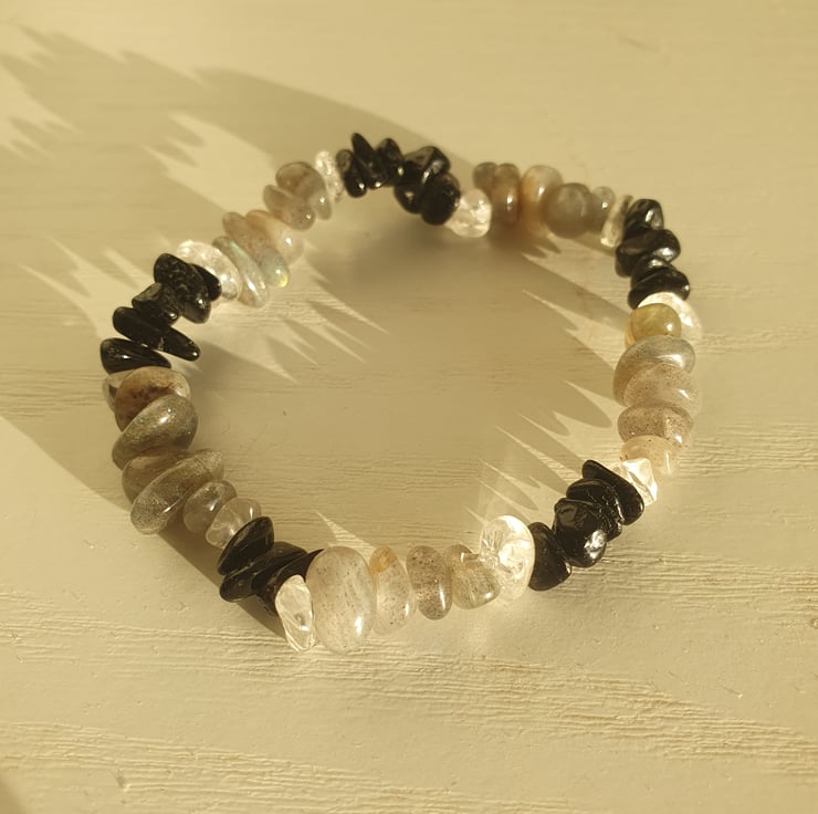 Grey labradorite, black tourmaline and clear quartz bracelet.