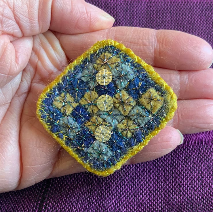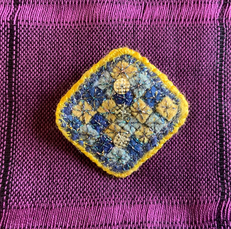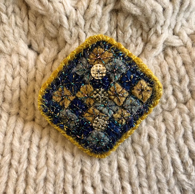 I had lots of lovely left over pure wool and wanted to create a mini brooch with a checkered design. I enjoyed creating the pattern and giving it lots of sparkle that reflects beautifully in the light using metalic threads which reflect many colours of gold blue and green.